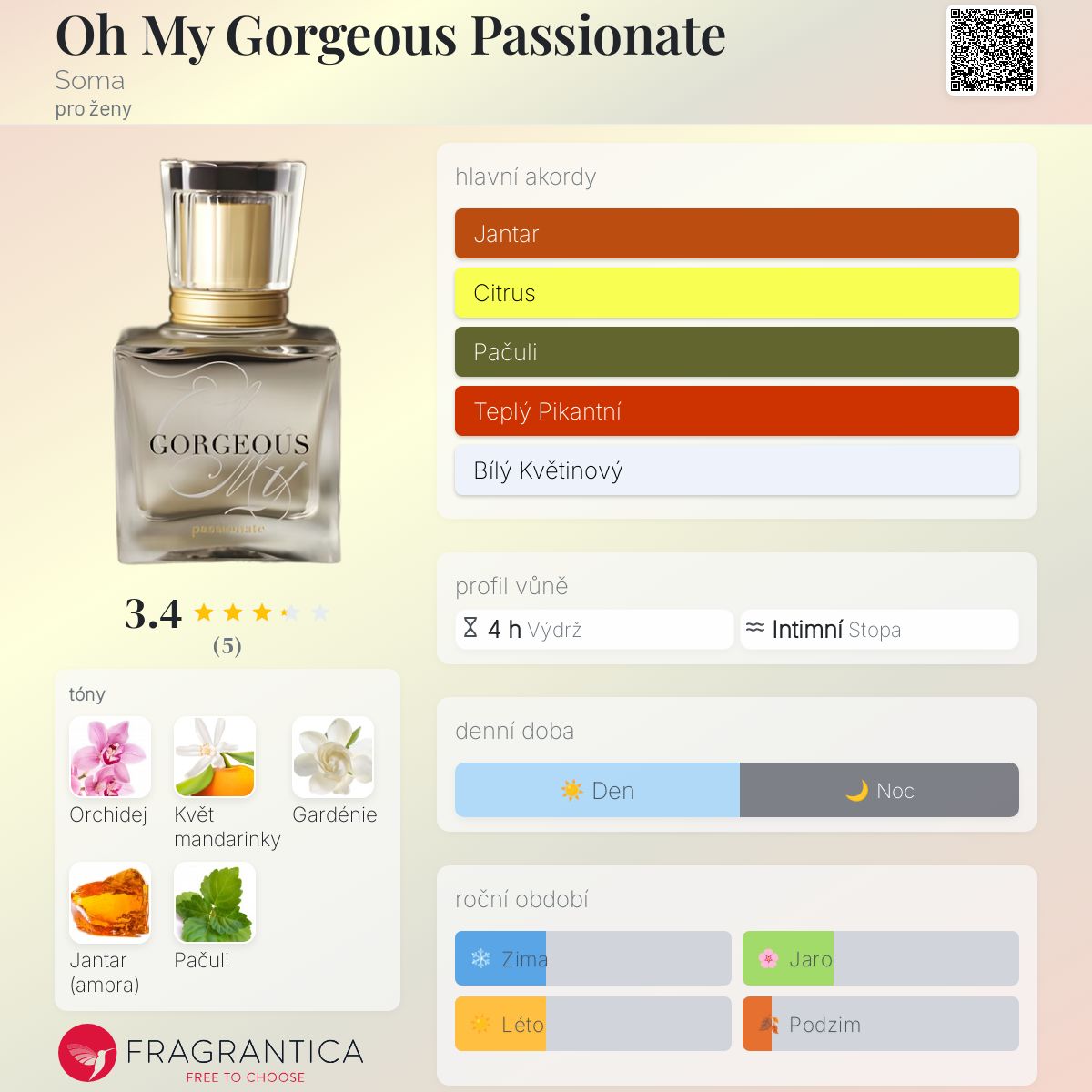 Oh My Gorgeous Passionate podle Soma je Orientální Floral vůně pro ženy. Oh My Gorgeous Passionate byl/a uveden/a v roce 2011. Vrchní tón je Mandarinkový květ ; střední tóny jsouVanilková orchidej a Gardénie ; základní tóny jsou Jantar (ambra) a Pačuli.
