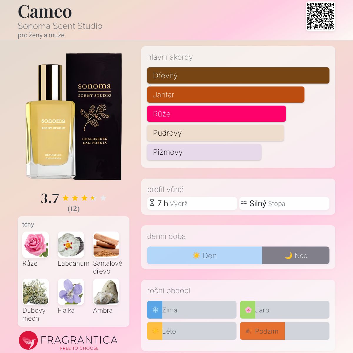Cameo podle Sonoma Scent Studio je Floral Woody Musk vůně pro ženy a muže. Cameo byl/a uveden/a v roce 2009. "Nosem" za touto vůní je Laurie Erickson. Vrchní tón je Růže ; střední tón jeFialka ; základní tóny jsou Labdanum, Santalové dřevo, Dubový mech, Ambra, Cedr, Pižmo a Kořen orris.
