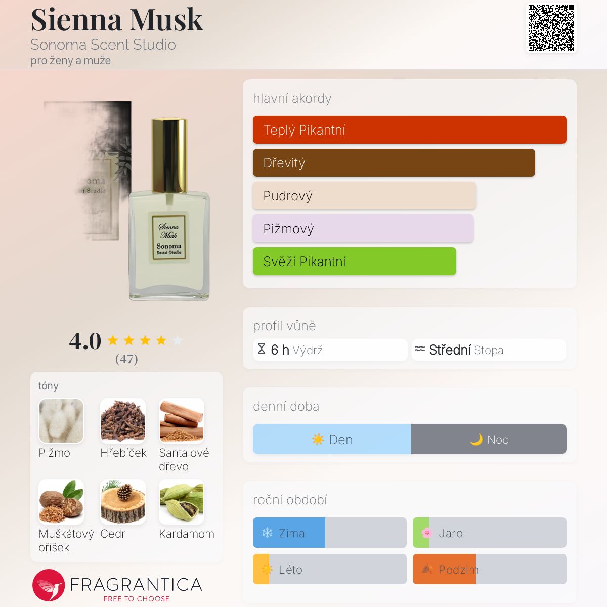 Sienna Musk podle Sonoma Scent Studio je Orientální Woody vůně pro ženy a muže. Sienna Musk byl/a uveden/a v roce 2008. "Nosem" za touto vůní je Laurie Erickson.