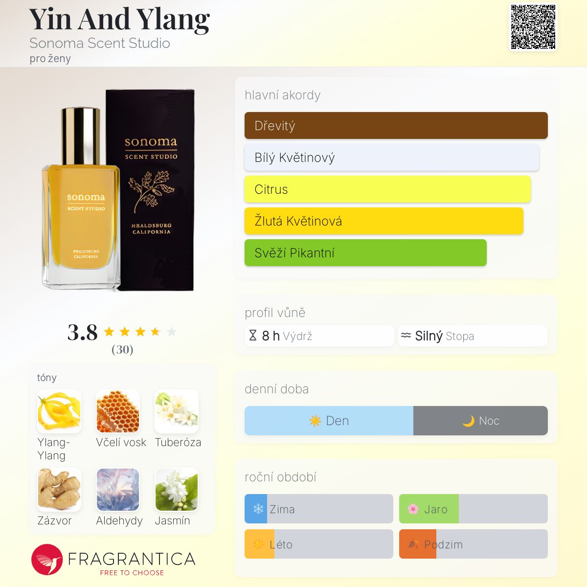 Yin And Ylang podle Sonoma Scent Studio je Orientální Floral vůně pro ženy. Yin And Ylang byl/a uveden/a v roce 2014. "Nosem" za touto vůní je Laurie Erickson. Vrchní tóny jsou Aldehydy, Krvavý pomeranč a Bergamot; střední tóny jsouYlang-Ylang, Včelí vosk, Tuberóza, Zázvor, Jasmín a Růže ; základní tóny jsou Dubový mech, Vanilka, Pižmo, Pačuli, Jantar (ambra) a Santalové dřevo.