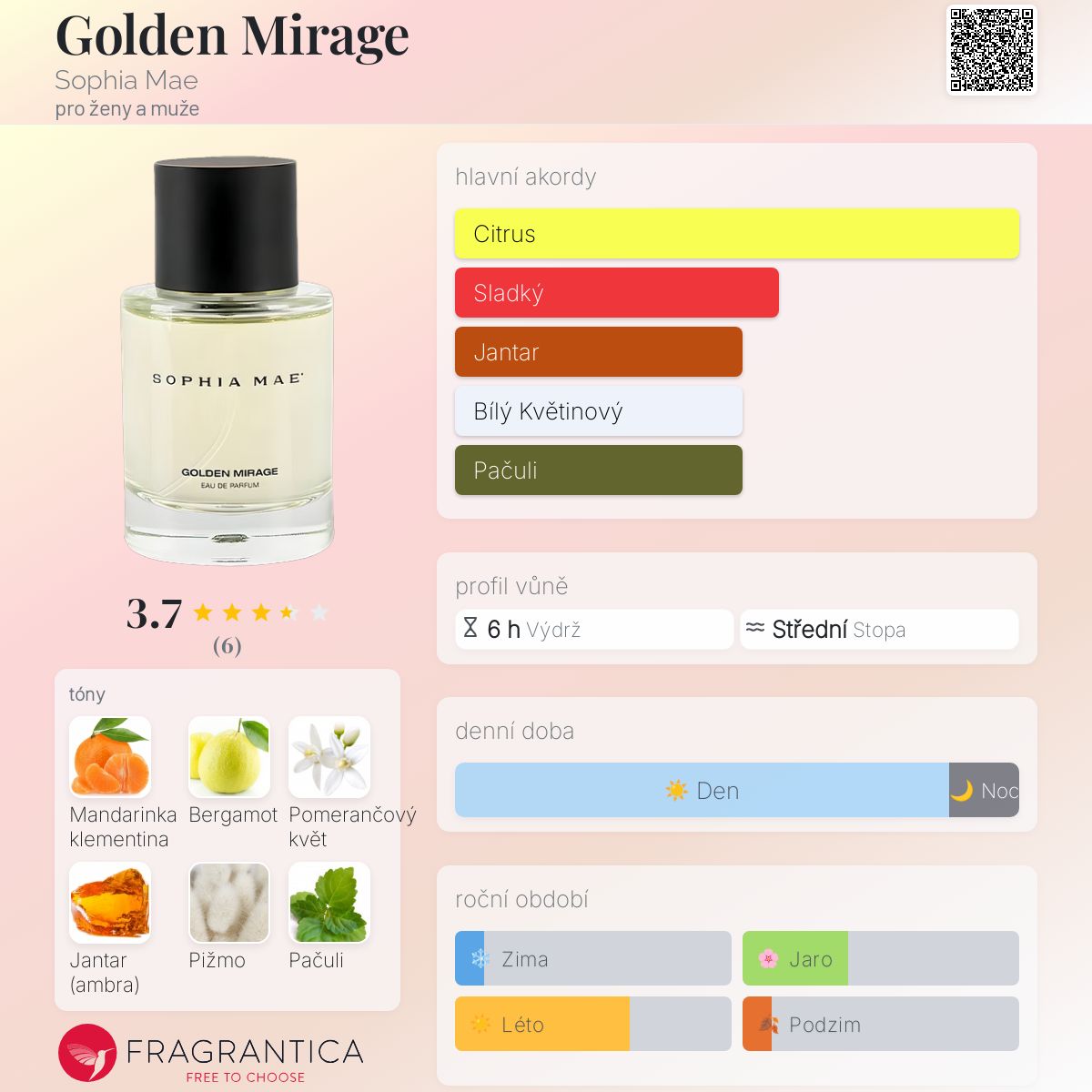 Golden Mirage podle Sophia Mae je Orientální Floral vůně pro ženy a muže. Golden Mirage byl/a uveden/a v roce 2023. Vrchní tóny jsou Mandarinka klementina a Kalábrijský bergamot; střední tón jePomerančový květ ; základní tóny jsou Jantar (ambra), Pižmo a Pačuli.