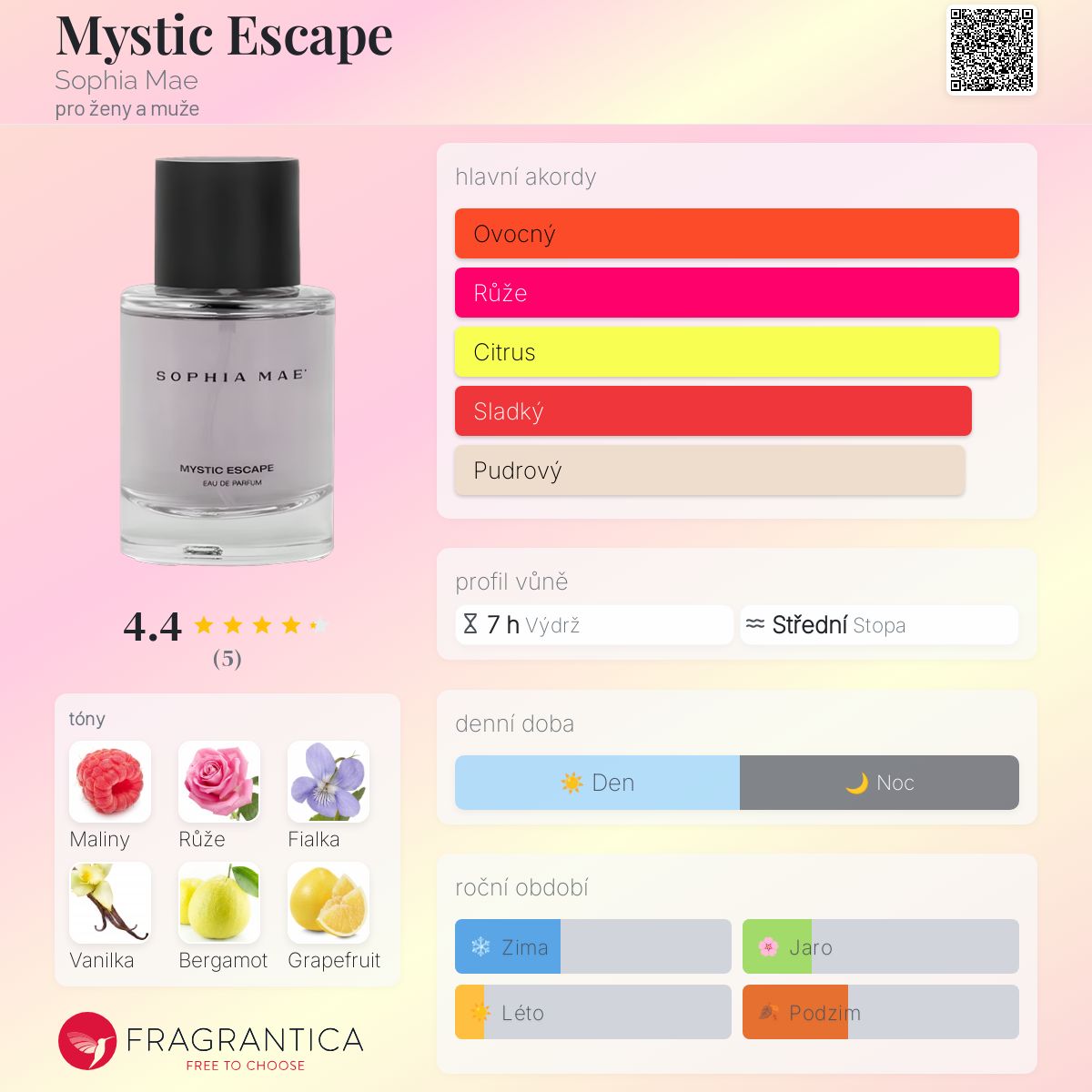 Mystic Escape podle Sophia Mae je Orientální Floral vůně pro ženy a muže. Mystic Escape byl/a uveden/a v roce 2023. Vrchní tóny jsou Maliny, Bergamot a Grapefruit; střední tóny jsouRůže, Fialka a Neroli ; základní tóny jsou Vanilka, Pižmo a Benzoin.