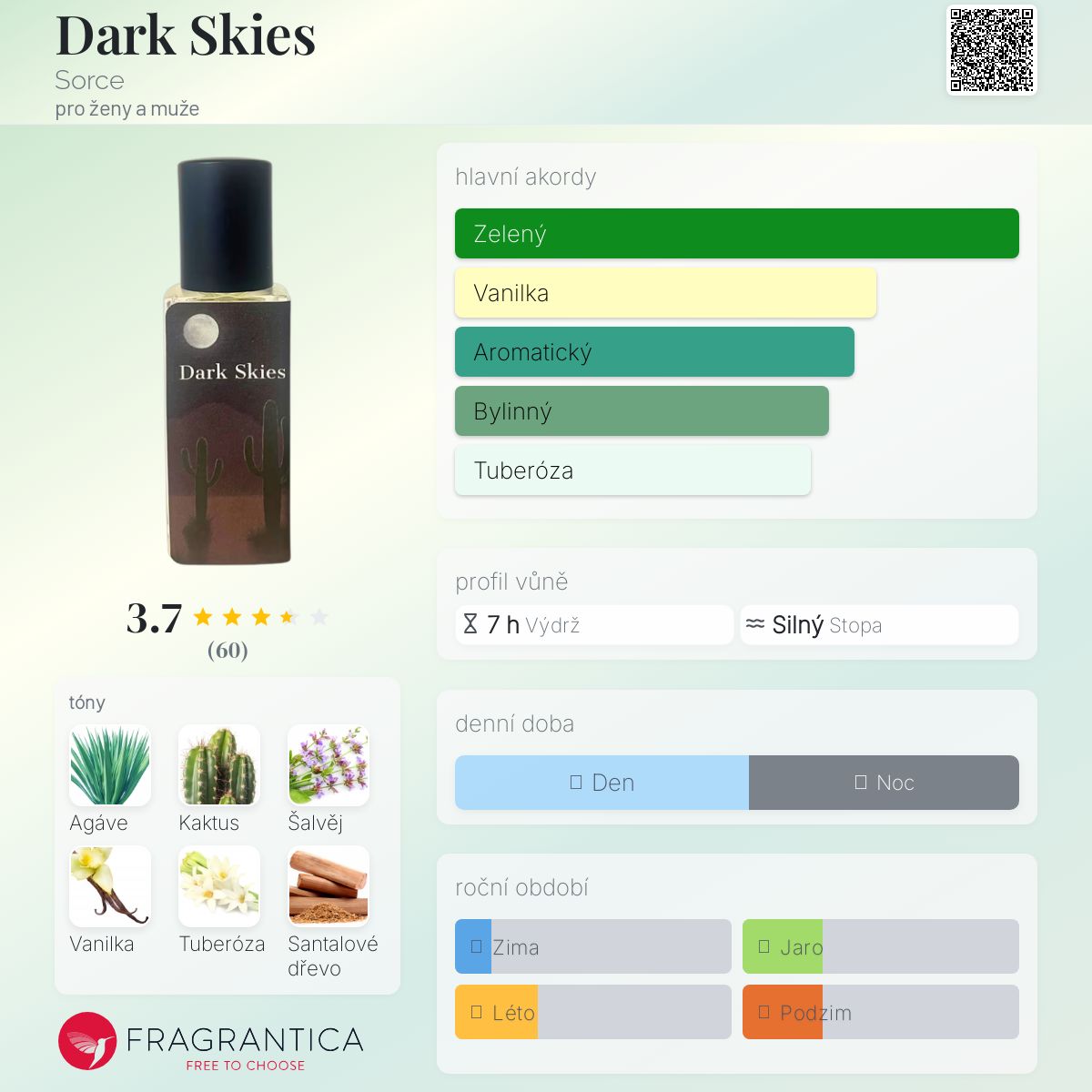 Dark Skies podle Sorce je Aromatic vůně pro ženy a muže. Toto je nová vůně. Dark Skies byl/a uveden/a v roce 2024. "Nosem" za touto vůní je Caitlin Hayes.