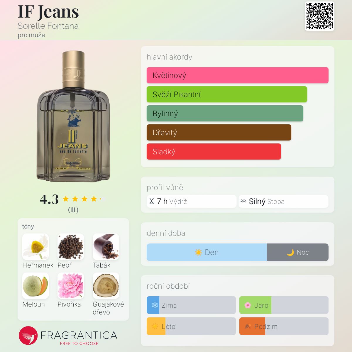 IF Jeans podle Sorelle Fontana je vůně pro muže. IF Jeans byl/a uveden/a v roce 2000. Vrchní tóny jsou Heřmánek, Tabák, Grapefruit, Citronová verbena a Fialkový list; střední tóny jsouBílý pepř, Meloun, Pivoňka a Hrachor ; základní tóny jsou Guajakové dřevo, Fazole tonka, Extrakt z bílého cedru a Pižmo.