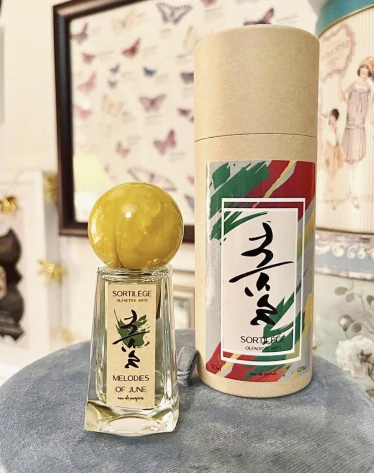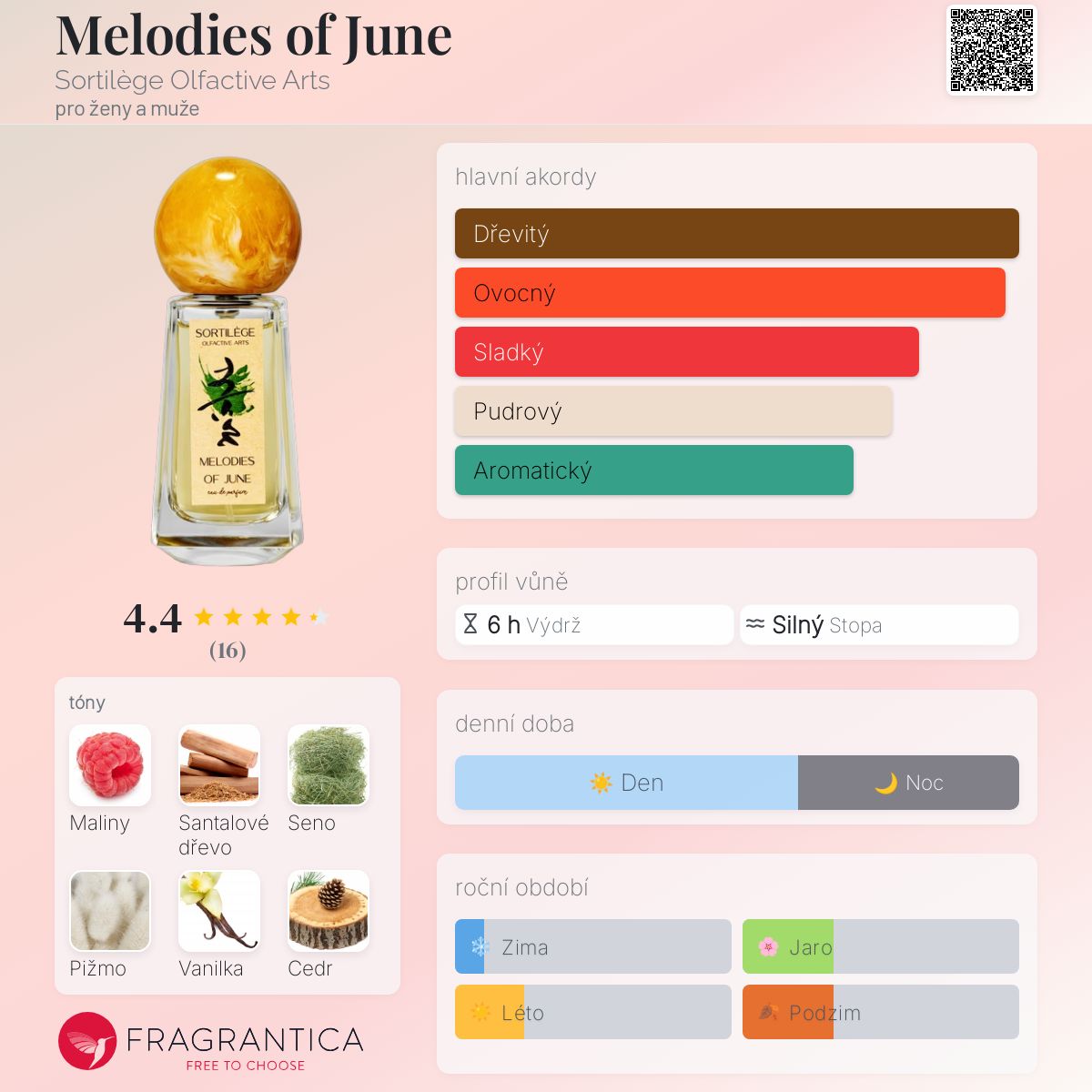 Melodies of June podle Sortilège Olfactive Arts je Aromatic Green vůně pro ženy a muže. Melodies of June byl/a uveden/a v roce 2022. "Nosem" za touto vůní je Tomi Cordiani. Vrchní tóny jsou Levandule, Šalvěj muškátová a Bergamot; střední tóny jsouMaliny, Seno, Cedr, Černý rybíz, Jedle a Rajčatový list ; základní tóny jsou Santalové dřevo, Pižmo a Vanilka.