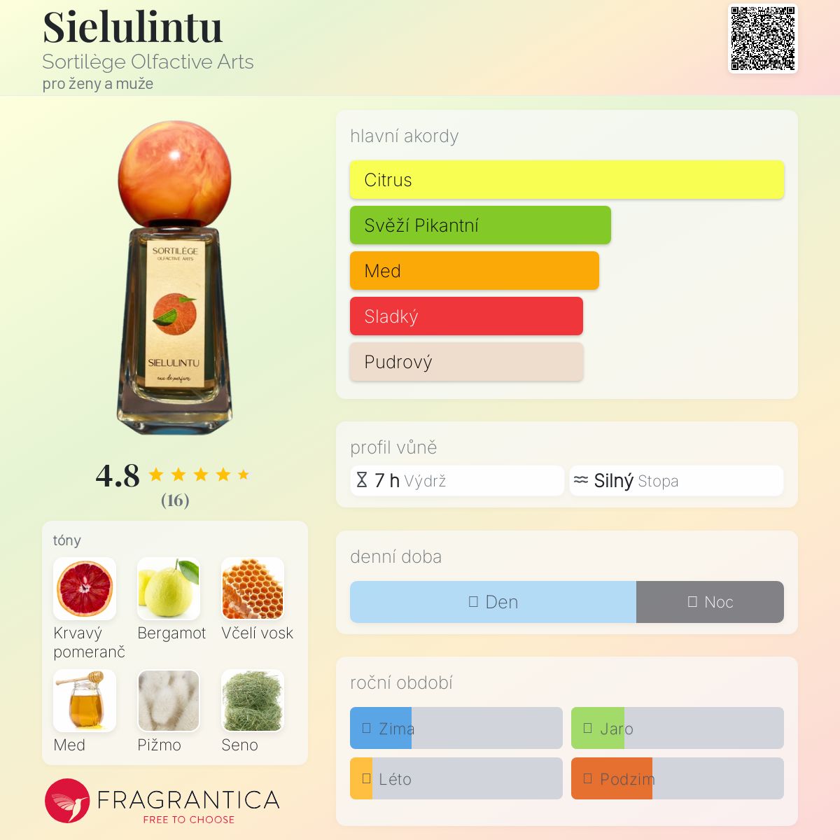 Sielulintu podle Sortilège Olfactive Arts je Floral Woody Musk vůně pro ženy a muže. Toto je nová vůně. Sielulintu byl/a uveden/a v roce 2024. "Nosem" za touto vůní je Tomi Cordiani. Vrchní tóny jsou Krvavý pomeranč a Bergamot; střední tóny jsouVčelí vosk, Med, Seno a Kosatec ; základní tóny jsou Pižmo, Vanilka, Bílé dřevo a Cedr.