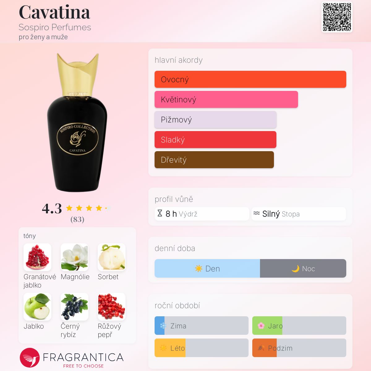 Cavatina podle Sospiro Perfumes je Floral Fruity vůně pro ženy a muže. Toto je nová vůně. Cavatina byl/a uveden/a v roce 2025. "Nosem" za touto vůní je Elodie Bernard. Vrchní tóny jsou Granátové jablko, Sorbet, Černý rybíz, Růžový pepř a Mandarinka; střední tóny jsouMagnólie, Jablko, Jasmín, Růže a Frézie ; základní tóny jsou Grenadina, Ambroxan a Bílé pižmo.