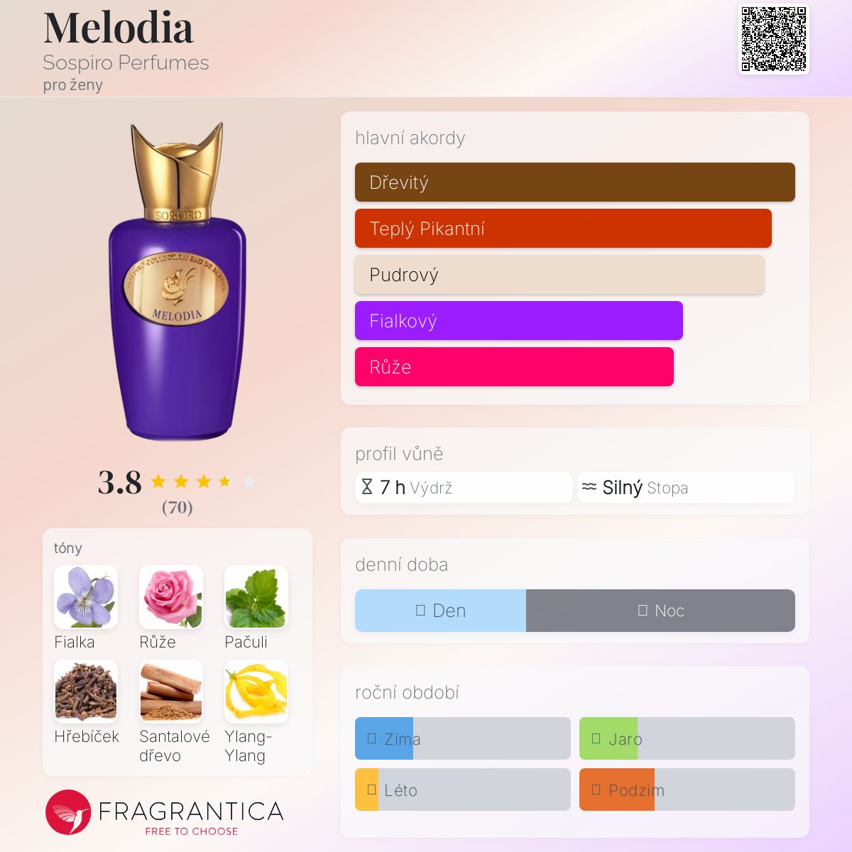 Melodia podle Sospiro Perfumes je Orientální Floral vůně pro ženy. Melodia byl/a uveden/a v roce 2013. "Nosem" za touto vůní je Chris Maurice. Vrchní tóny jsou Bulharská růže a Hřebíček; střední tóny jsouFialka, Damašská růže a Ylang-Ylang ; základní tóny jsou Pačuli, Santalové dřevo, Bílé pižmo a Madagaskarská vanilka.