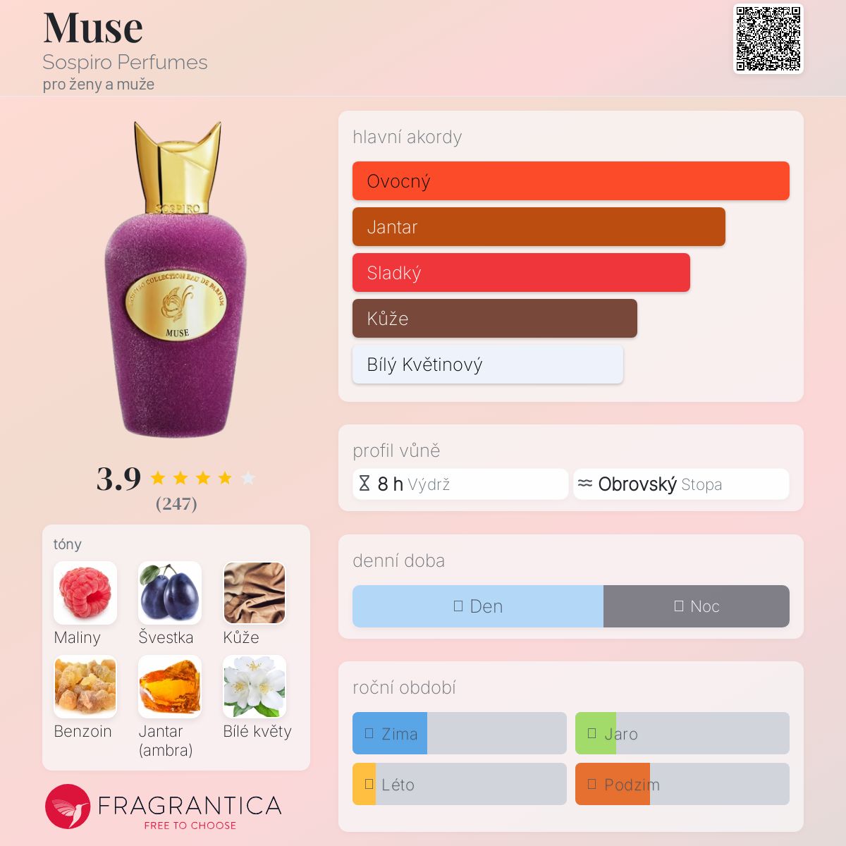 Muse podle Sospiro Perfumes je Orientální Floral vůně pro ženy a muže. Muse byl/a uveden/a v roce 2018. Vrchní tóny jsou Švestka, Kůže a Bílé květy; střední tóny jsouLabdanum, Pelyněk a Jasmín ; základní tóny jsou Maliny, Benzoin, Jantar (ambra) a Pačuli.