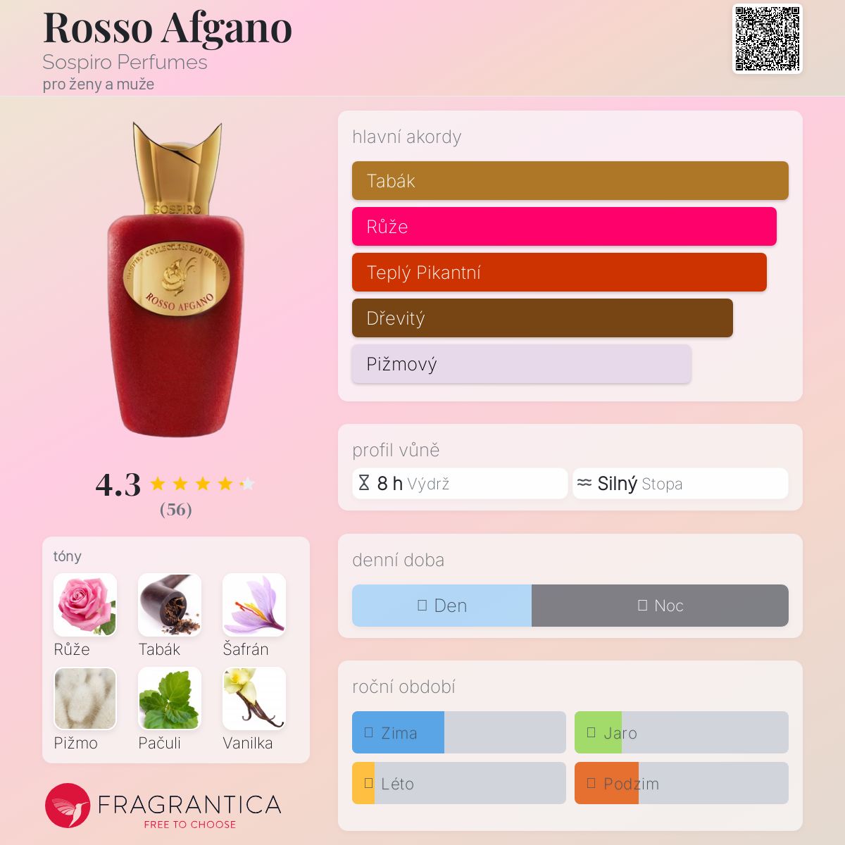Rosso Afgano podle Sospiro Perfumes je Orientální Floral vůně pro ženy a muže. Rosso Afgano byl/a uveden/a v roce 2014. "Nosem" za touto vůní je Chris Maurice. Vrchní tóny jsou Růže a Šafrán; střední tóny jsouPačuli a Cedr ; základní tóny jsou Tabák, Pižmo a Vanilka.