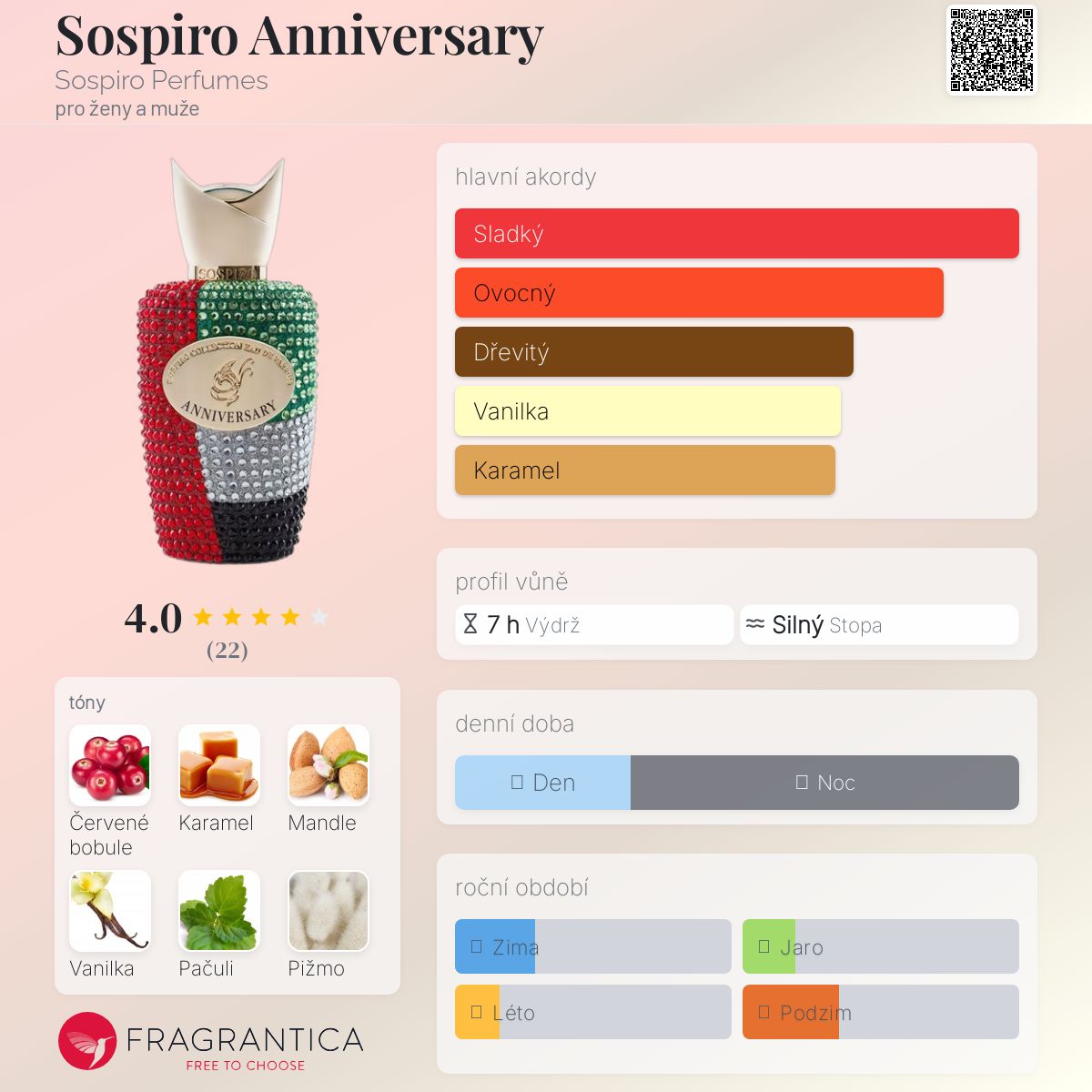 Sospiro Anniversary podle Sospiro Perfumes je Orientální Vanilla vůně pro ženy a muže. Sospiro Anniversary byl/a uveden/a v roce 2015. "Nosem" za touto vůní je Chris Maurice. Vrchní tóny jsou Červené bobule, Mandle a Zelené tóny; střední tóny jsouPačuli, Cedr a Kokos ; základní tóny jsou Karamel, Vanilka, Pižmo a Tabák.