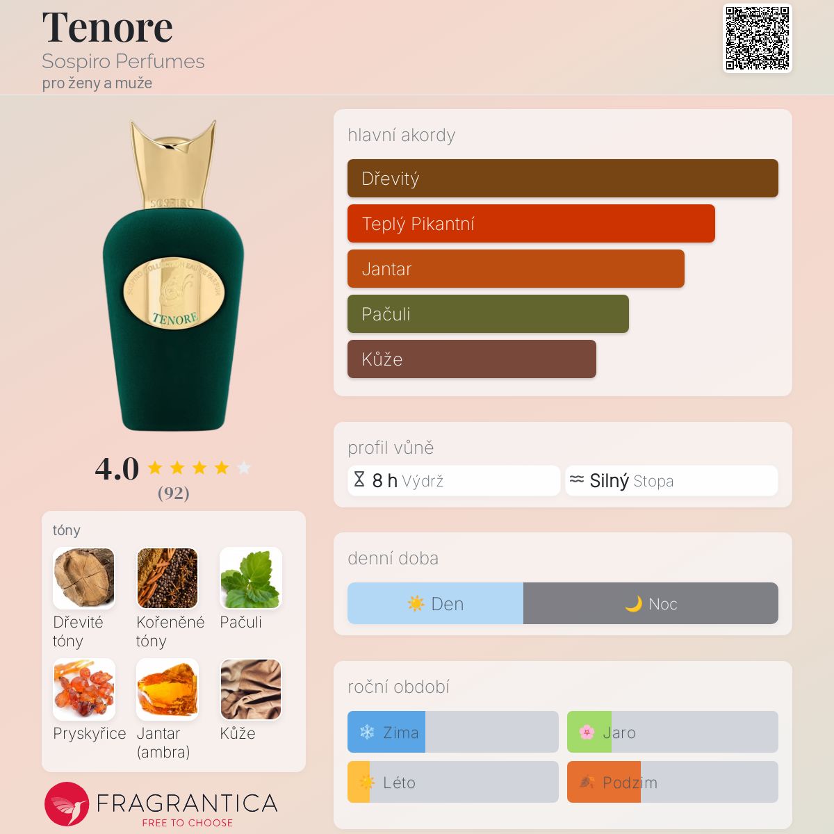 Tenore podle Sospiro Perfumes je vůně pro ženy a muže. Tenore byl/a uveden/a v roce 2022. "Nosem" za touto vůní je Christian Provenzano. Vrchní tóny jsou Levandule a Citrón; střední tóny jsouKořeněné tóny, Pryskyřice, Kůže, Hřebíček a Konvalinka ; základní tóny jsou Dřevité tóny, Pačuli, Jantar (ambra) a Pižmo.