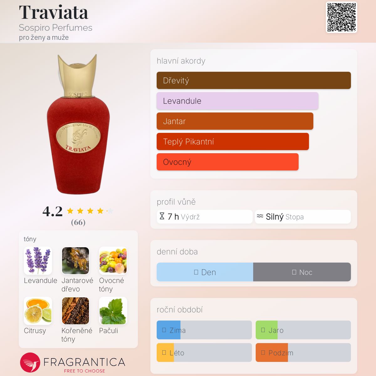 Traviata podle Sospiro Perfumes je vůně pro ženy a muže. Toto je nová vůně. Traviata byl/a uveden/a v roce 2024. "Nosem" za touto vůní je Christian Provenzano. Vrchní tóny jsou Levandule, Citrusy a Bylinné tóny; střední tóny jsouOvocné tóny, Koření a Květinové tóny ; základní tóny jsou Jantarové dřevo, Pačuli a Cedr.