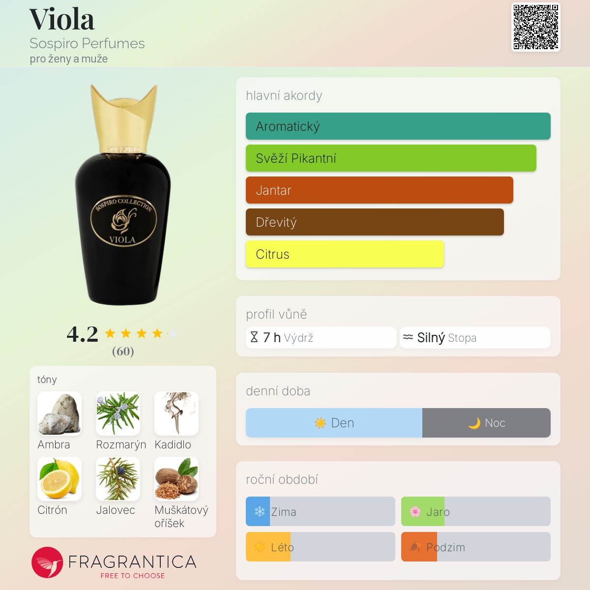 Viola podle Sospiro Perfumes je Woody Aromatic vůně pro ženy a muže. Toto je nová vůně. Viola byl/a uveden/a v roce 2025. "Nosem" za touto vůní je Dominique Moellhausen. Vrchní tóny jsou Citrón, Jalovec, Šalvěj muškátová, Bergamot a Pepř; střední tóny jsouAmbra, Rozmarýn, Kadidlo a Muškátový oříšek ; základní tóny jsou Santalové dřevo, Cedr, Vetiver, Dubový mech a Jantar (ambra).