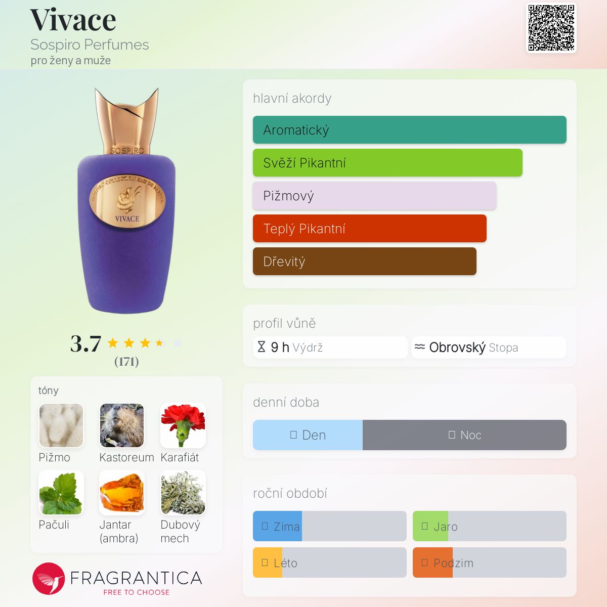 Vivace podle Sospiro Perfumes je Woody Chypre vůně pro ženy a muže. Vivace byl/a uveden/a v roce 2011. "Nosem" za touto vůní je Chris Maurice. Vrchní tóny jsou Bazalka, Šalvěj muškátová, Oregano a Citron amalfi; střední tóny jsouKarafiát, Pačuli, Pelargónie a Skořice ; základní tóny jsou Pižmo, Kastoreum, Jantar (ambra), Dubový mech a Francouzské labdanum.