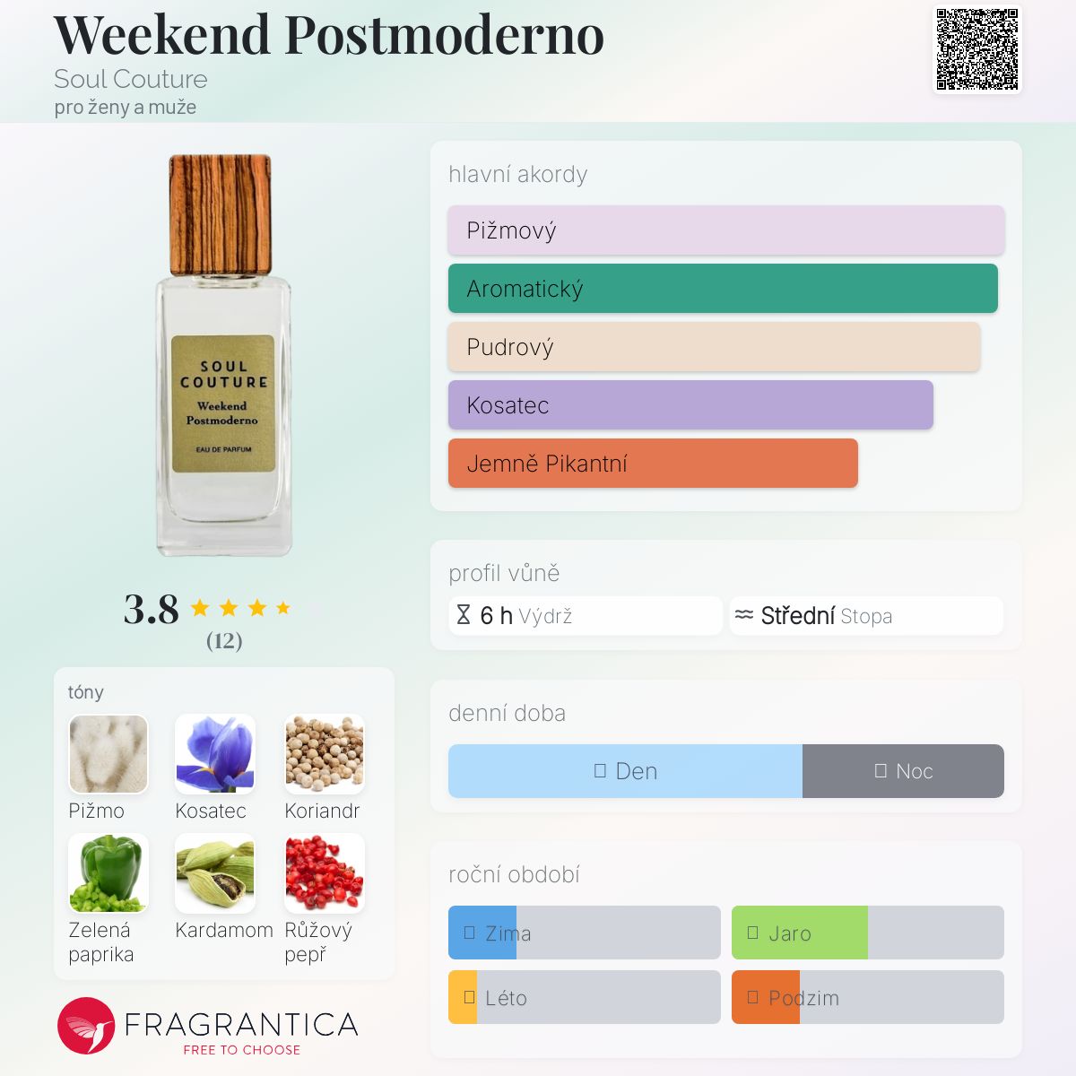 Weekend Postmoderno podle Soul Couture je Aromatic Spicy vůně pro ženy a muže. Weekend Postmoderno byl/a uveden/a v roce 2017. "Nosem" za touto vůní je Michele Marin.