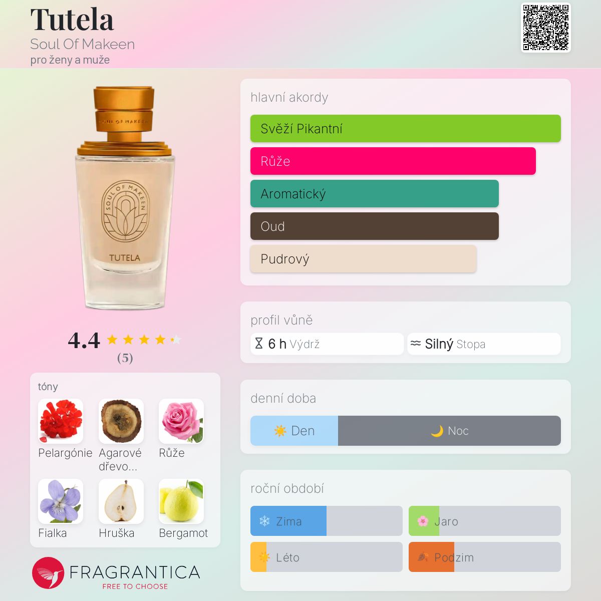 Tutela podle Soul Of Makeen je Orientální vůně pro ženy a muže. Vrchní tóny jsou Pelargónie, Bulharská růže a Bergamot; střední tóny jsouFialka, Hruška a Fialkový list ; základní tóny jsou Agarové dřevo (oud), Ambroxan, Šafrán, Pačuli, Labdanum, Australské santalové dřevo a Pižmo.