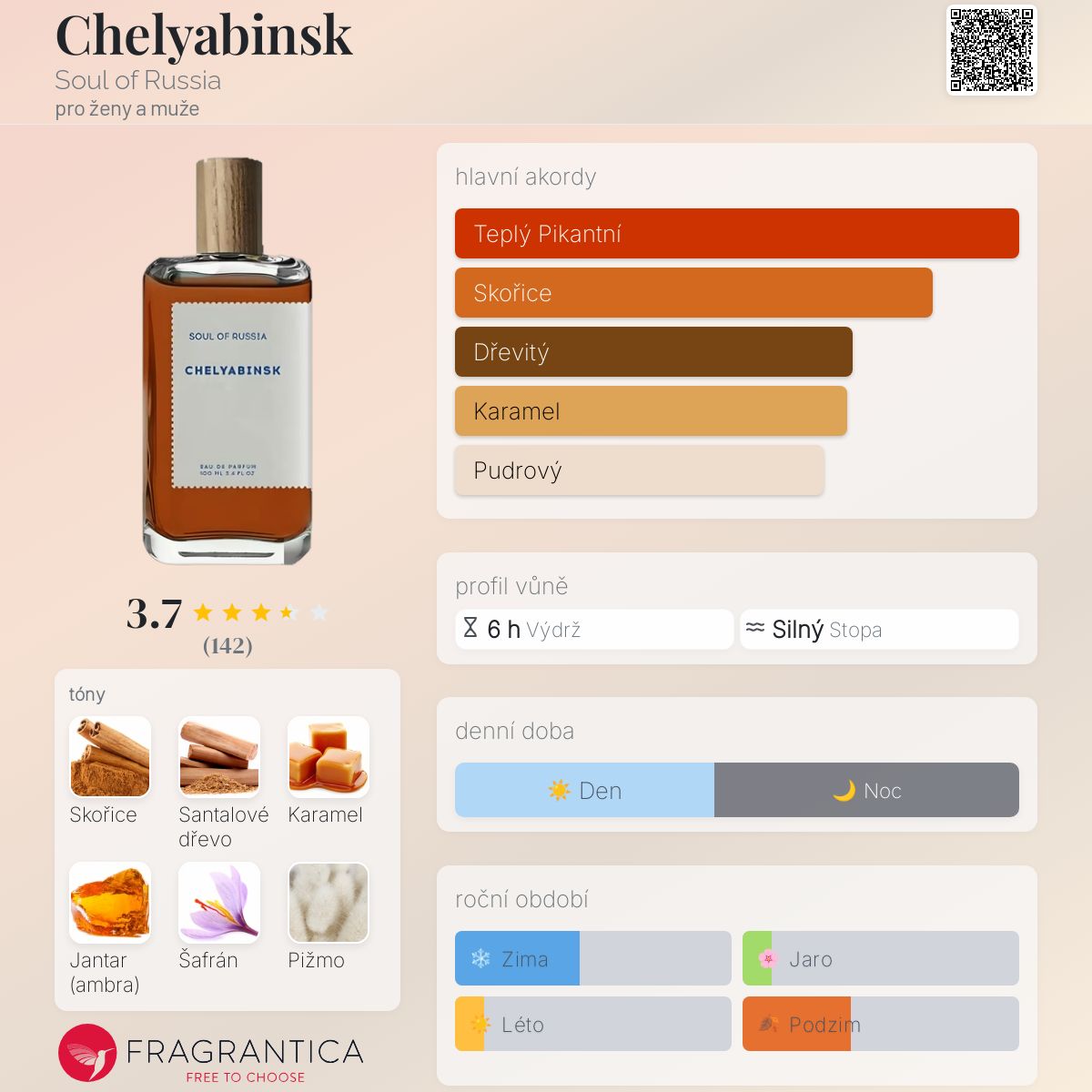 Chelyabinsk podle Soul of Russia je Orientální Spicy vůně pro ženy a muže. Toto je nová vůně. Chelyabinsk byl/a uveden/a v roce 2024. Vrchní tóny jsou Skořice a Šafrán; střední tóny jsouSantalové dřevo a Karamel ; základní tóny jsou Jantar (ambra) a Pižmo.