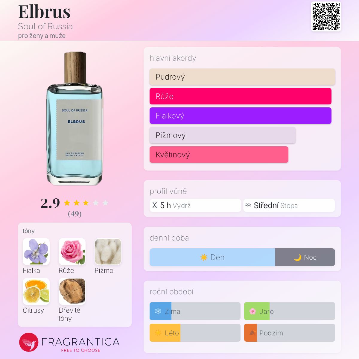 Elbrus podle Soul of Russia je Floral Woody Musk vůně pro ženy a muže. Toto je nová vůně. Elbrus byl/a uveden/a v roce 2024. Vrchní tón je Citrusy ; střední tóny jsouFialka a Růže ; základní tóny jsou Pižmo a Dřevité tóny.