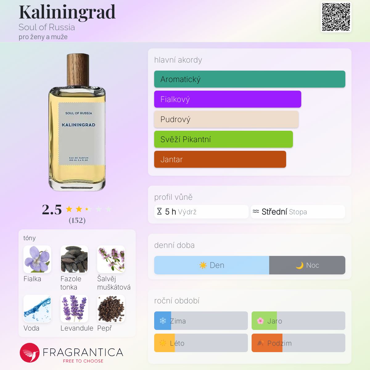 Kaliningrad podle Soul of Russia je vůně pro ženy a muže. Kaliningrad byl/a uveden/a v roce 2023. Vrchní tóny jsou Fialka, Vodní tóny, Černý a růžový pepř a Kardamom; střední tóny jsouŠalvěj muškátová a Levandule ; základní tóny jsou Fazole tonka, Pižmo a Jantar (ambra).