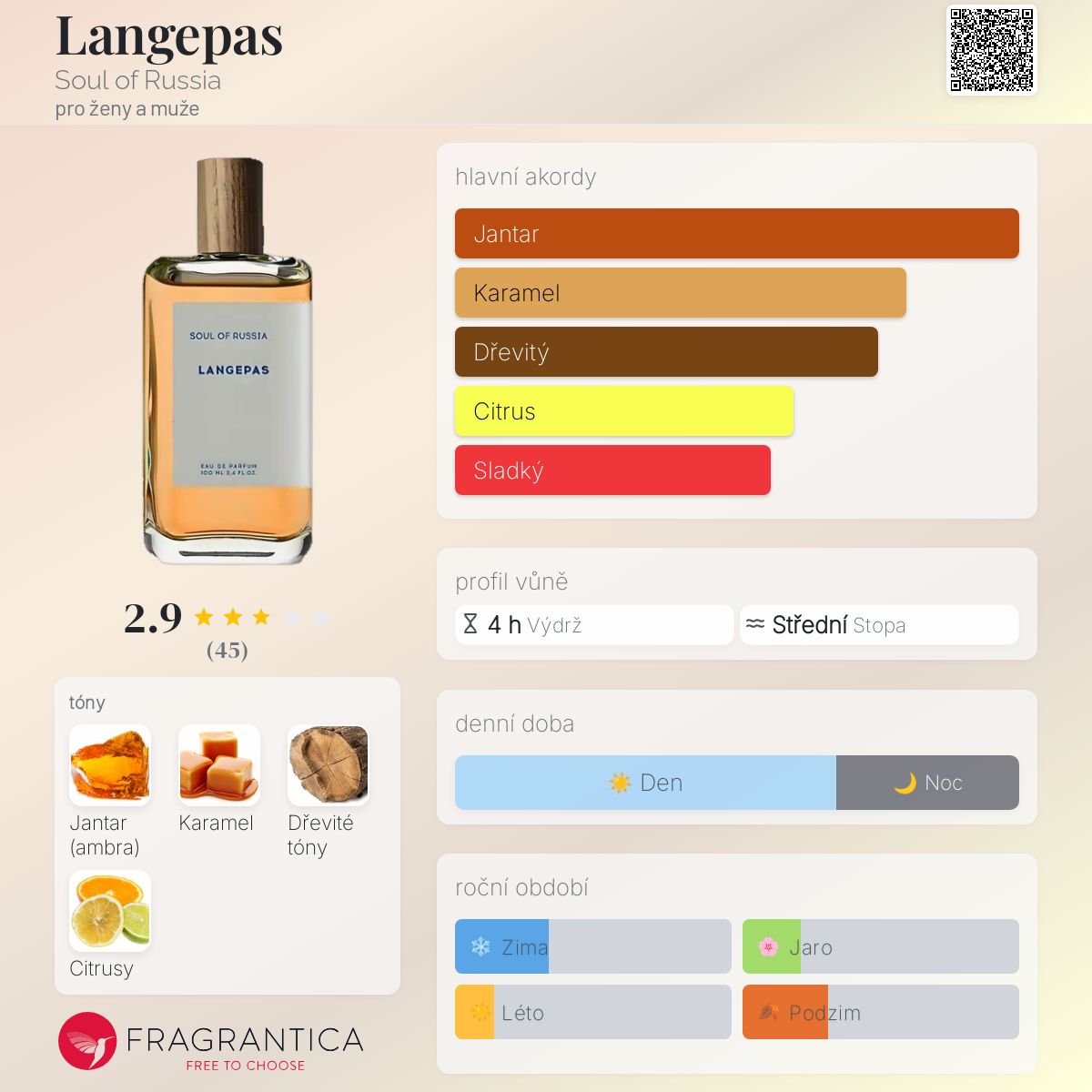 Langepas podle Soul of Russia je Orientální Vanilla vůně pro ženy a muže. Toto je nová vůně. Langepas byl/a uveden/a v roce 2024. Vrchní tón je Citrusy ; střední tón jeDřevité tóny ; základní tóny jsou Jantar (ambra) a Karamel.
