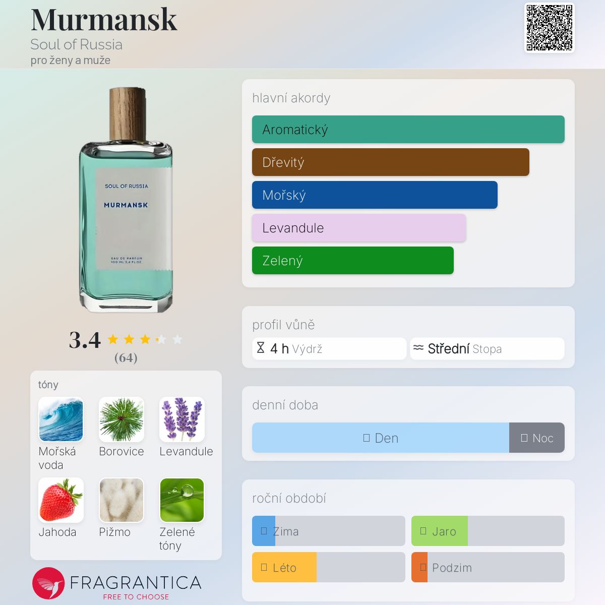 Murmansk podle Soul of Russia je Aromatic Aquatic vůně pro ženy a muže. Toto je nová vůně. Murmansk byl/a uveden/a v roce 2024. Vrchní tóny jsou Mořské tóny, Levandule a Jahoda; střední tóny jsouJehličí borovice a Bylinné tóny ; základní tóny jsou Pižmo a Cedr.