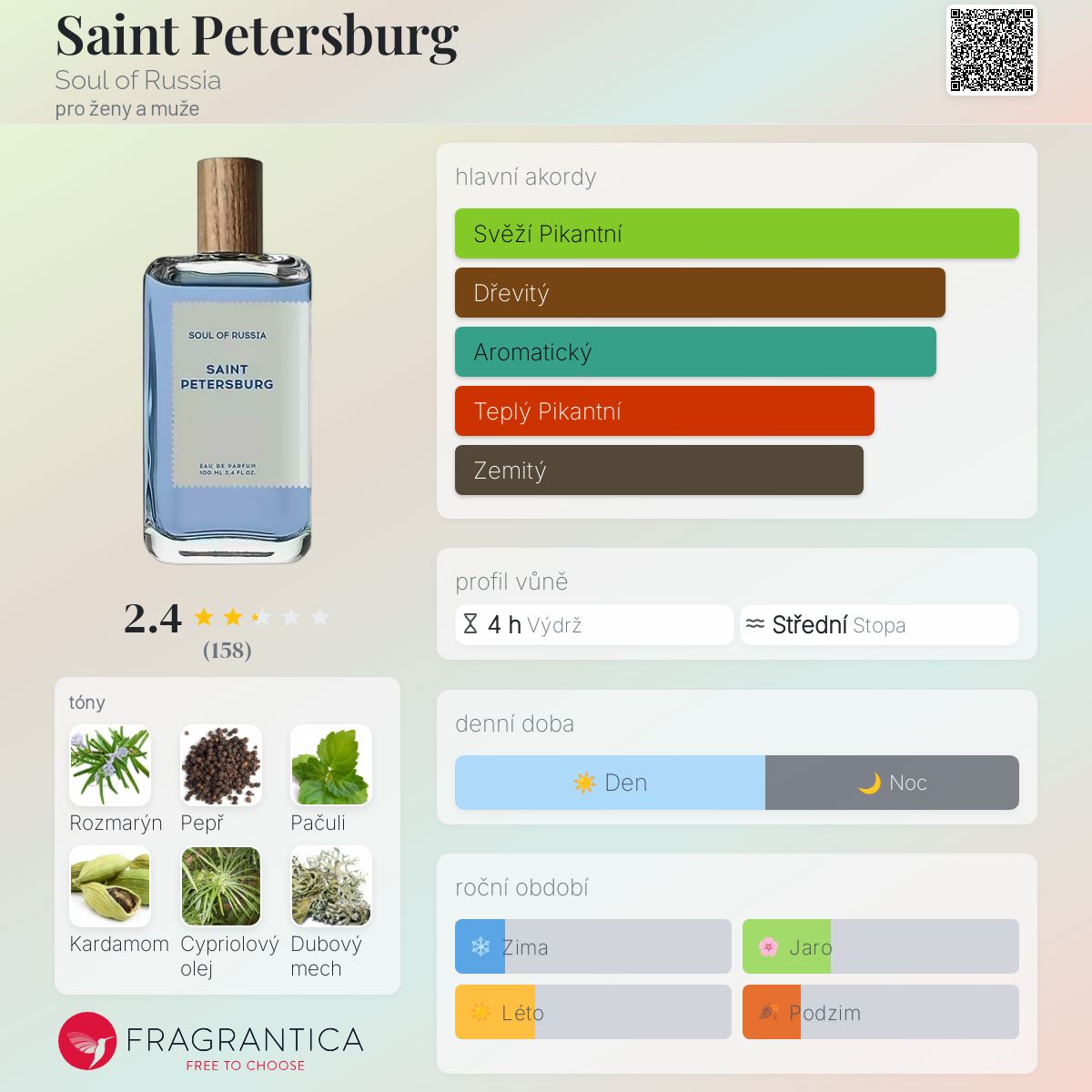 Saint Petersburg podle Soul of Russia je Woody Spicy vůně pro ženy a muže. Saint Petersburg byl/a uveden/a v roce 2023. Vrchní tóny jsou Rozmarýn, Jablko, Bergamot a Citrón; střední tóny jsouČerný pepř, Kardamom, Muškátový oříšek a Pelargónie ; základní tóny jsou Pačuli, Vetiver, Cypriolový olej a Dubový mech.