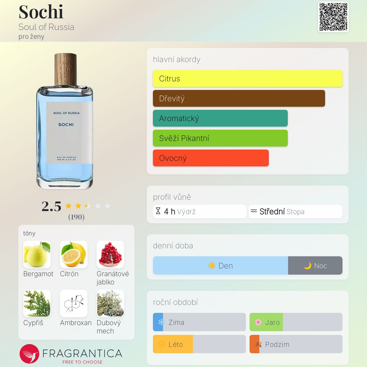 Sochi podle Soul of Russia je Citrus vůně pro ženy. Sochi byl/a uveden/a v roce 2023. Vrchní tóny jsou Bergamot, Citrón, Cypřiš a Černý rybíz; střední tóny jsouGranátové jablko, Cedr a Růže ; základní tóny jsou Ambroxan, Mech, Pižmo a Otočník.