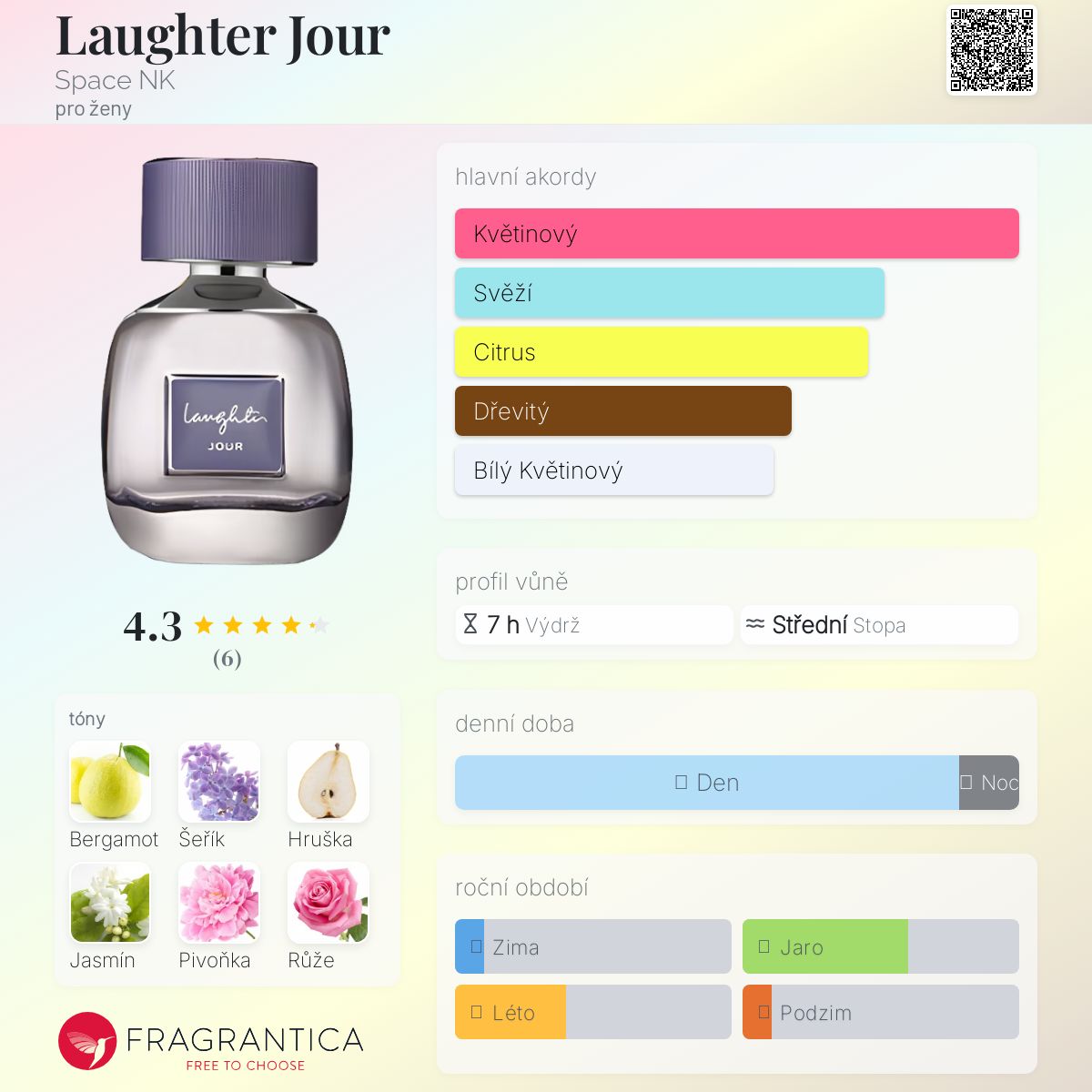 Laughter Jour podle Space NK je Floral Fruity vůně pro ženy. Laughter Jour byl/a uveden/a v roce 2011. Vrchní tóny jsou Bergamot a Hruška; střední tóny jsouŠeřík, Jasmín, Pivoňka a Růže ; základní tóny jsou Pižmo, Santalové dřevo a Virginský cedr.