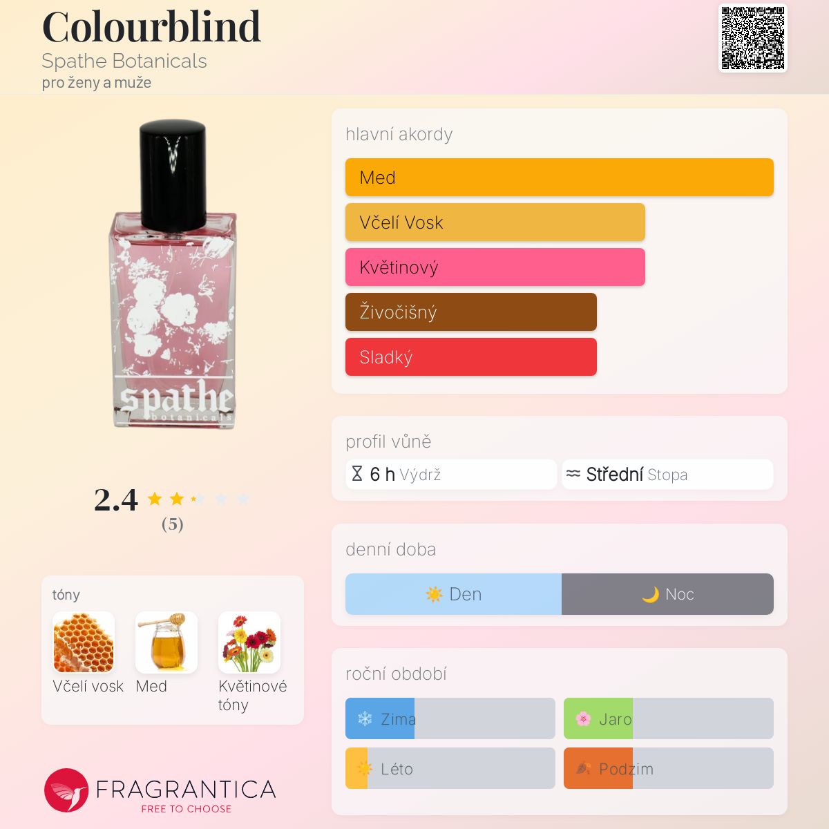 Colourblind podle Spathe Botanicals je vůně pro ženy a muže. "Nosem" za touto vůní je Dyllan Himbeault.