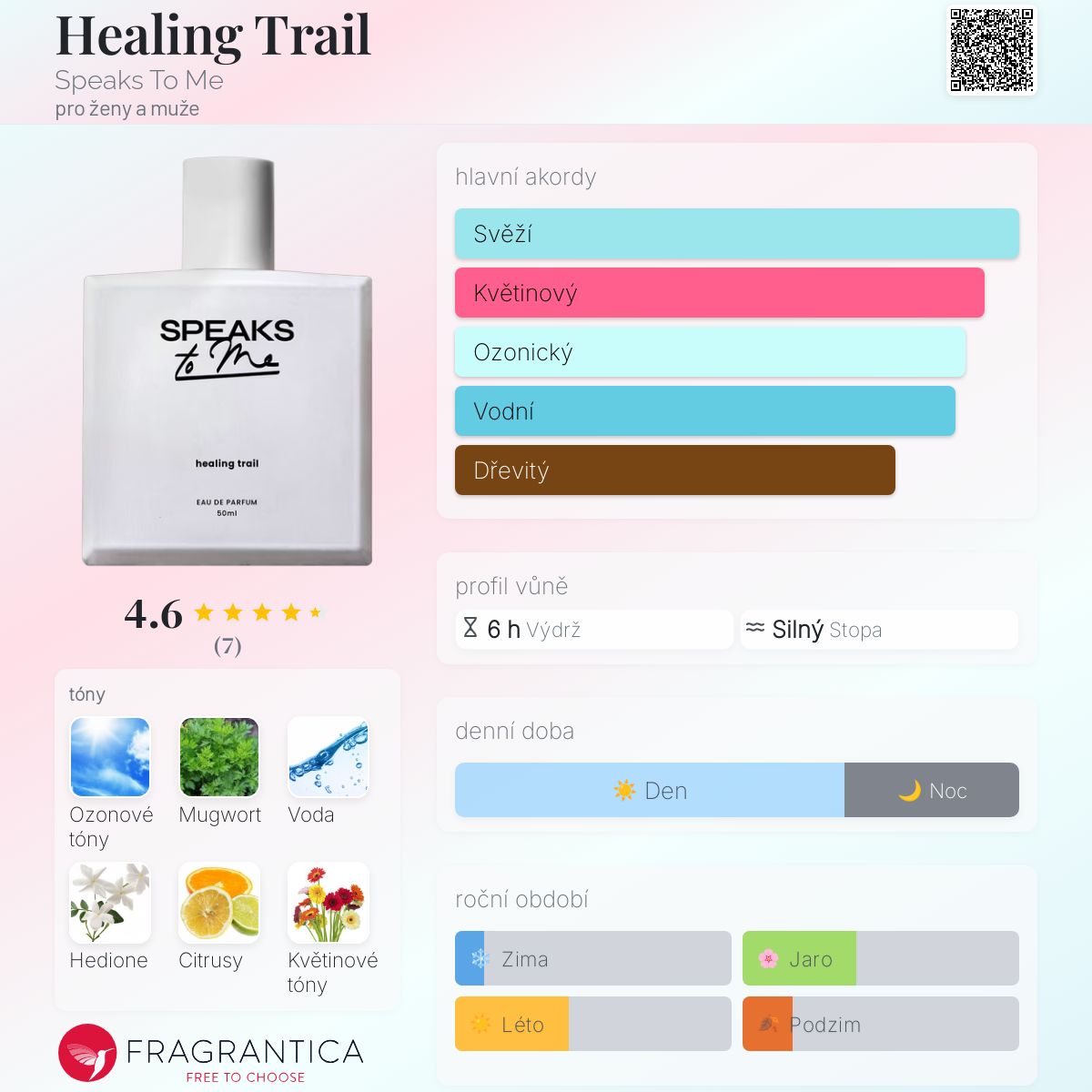 Healing Trail podle Speaks To Me je Floral Green vůně pro ženy a muže. Toto je nová vůně. Healing Trail byl/a uveden/a v roce 2024. "Nosem" za touto vůní je Nanako Ogi. Vrchní tóny jsou Ozonové tóny, Pelyněk černobýl a Citrusy; střední tóny jsouVodnaté tóny, Hedione, Květiny a Dřevité tóny ; základní tóny jsou Cedr, Dřevo akigala a Santalové dřevo.