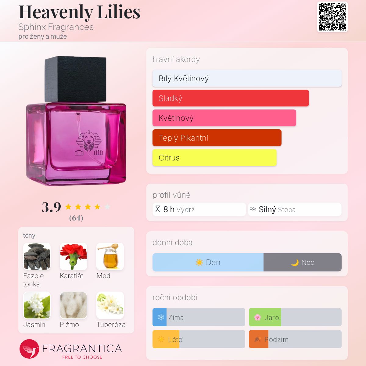 Heavenly Lilies podle Sphinx Fragrances je vůně pro ženy a muže. Heavenly Lilies byl/a uveden/a v roce 2022. Vrchní tóny jsou Karafiát, Med, Indická tuberóza, Gardénie, Švestka a Palisandr; střední tóny jsouEgyptský jasmín, Pižmo, Hořká mandle, Dřevité tóny, Šafrán, Cedr a Ambra ; základní tóny jsou Fazole tonka, Mandle, Bergamot, Citrón a Káva.