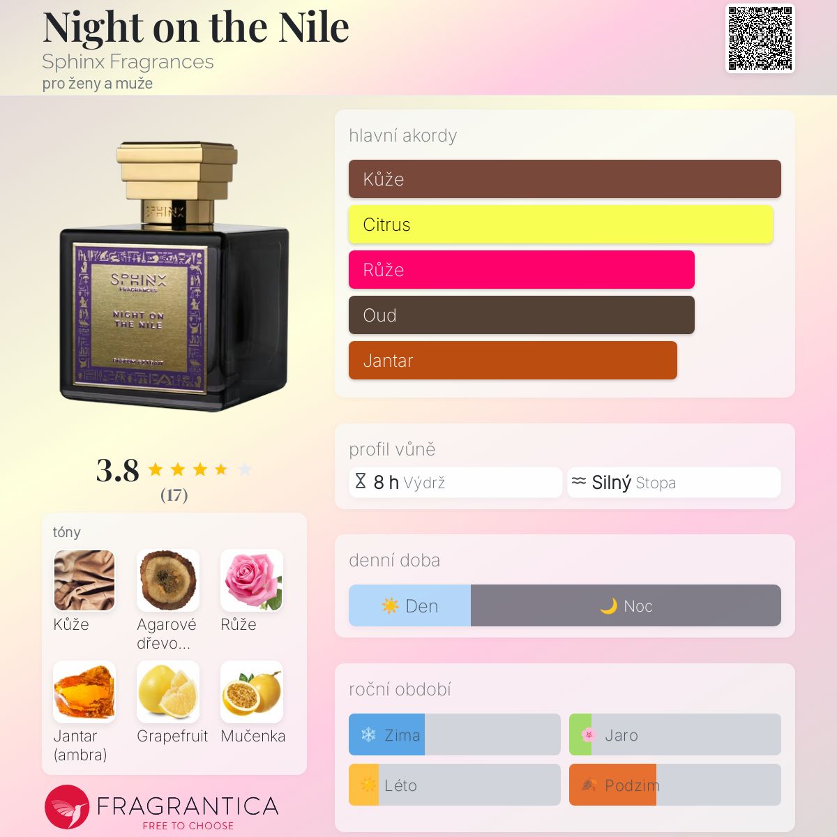 Night on the Nile podle Sphinx Fragrances je Orientální vůně pro ženy a muže. Toto je nová vůně. Night on the Nile byl/a uveden/a v roce 2025. Vrchní tóny jsou Grapefruit, Mučenka, Bergamot a Šafrán; střední tóny jsouAgarové dřevo (oud) a Pačuli ; základní tóny jsou Kůže, Turecká růže, Jantar (ambra) a Vanilka.