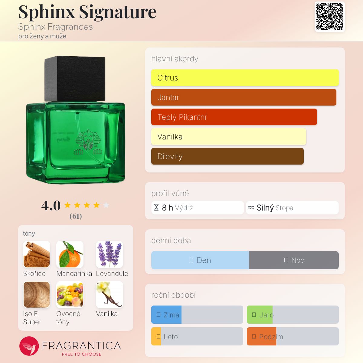 Sphinx Signature podle Sphinx Fragrances je Woody Spicy vůně pro ženy a muže. Sphinx Signature byl/a uveden/a v roce 2022. Vrchní tóny jsou Skořice, Mandarinka, Levandule a Citrón; střední tóny jsouOvocné tóny, Kmín, Kadidlo a Červený cedr ; základní tóny jsou Iso E Super, Vanilka, Benzoin, Tabák, Cedr, Kůže, Cypřiš a Pačuli.