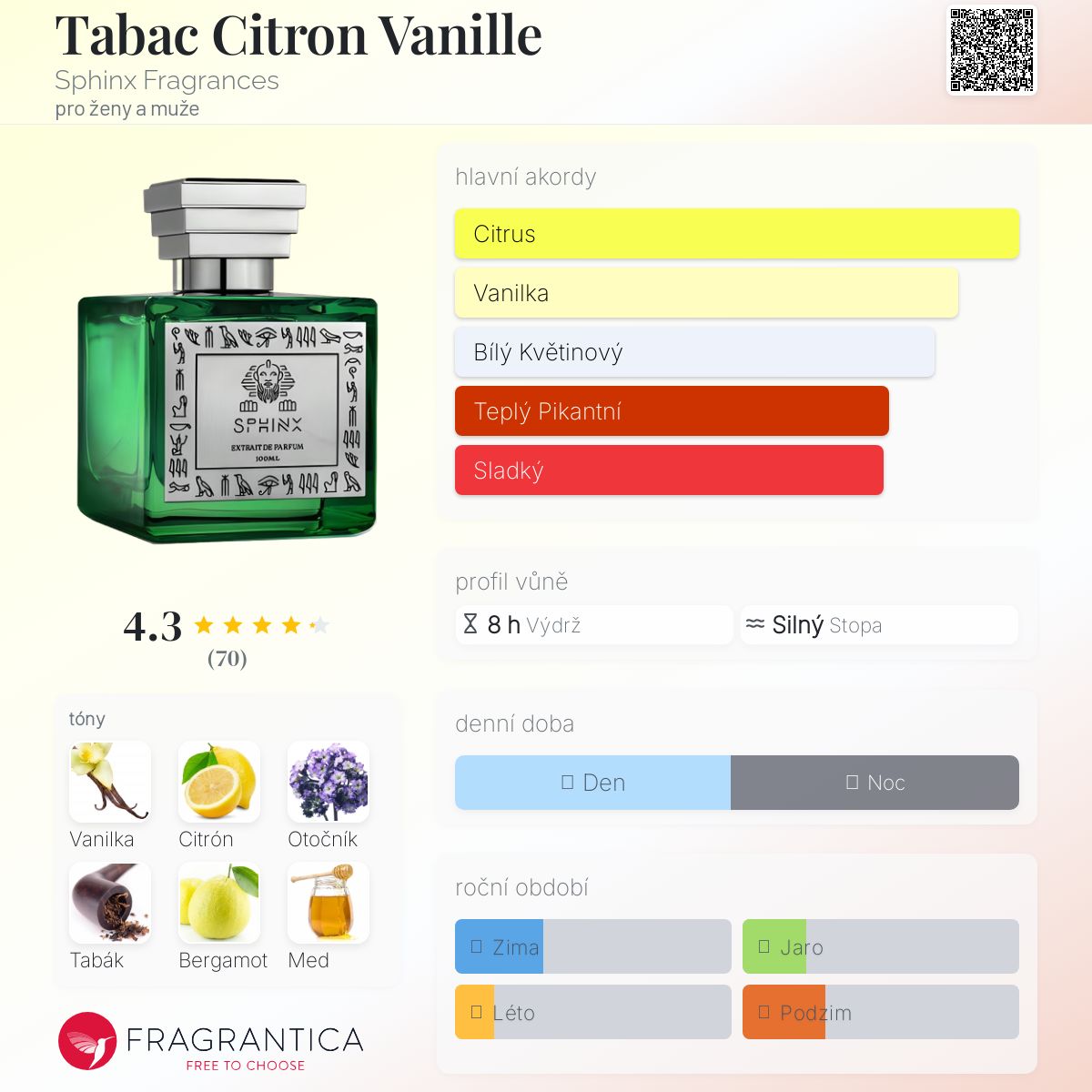 Tabac Citron Vanille podle Sphinx Fragrances je Orientální Fougere vůně pro ženy a muže. Tabac Citron Vanille byl/a uveden/a v roce 2022. Vrchní tóny jsou Citron amalfi , Bergamot, Pomerančový květ a Mandarinka; střední tóny jsouOtočník, Skořice, Jasmín, Konvalinka a Kardamom ; základní tóny jsou Vanilka, Tabák, Med, Fazole tonka, Pačuli, Santalové dřevo a Vetiver.