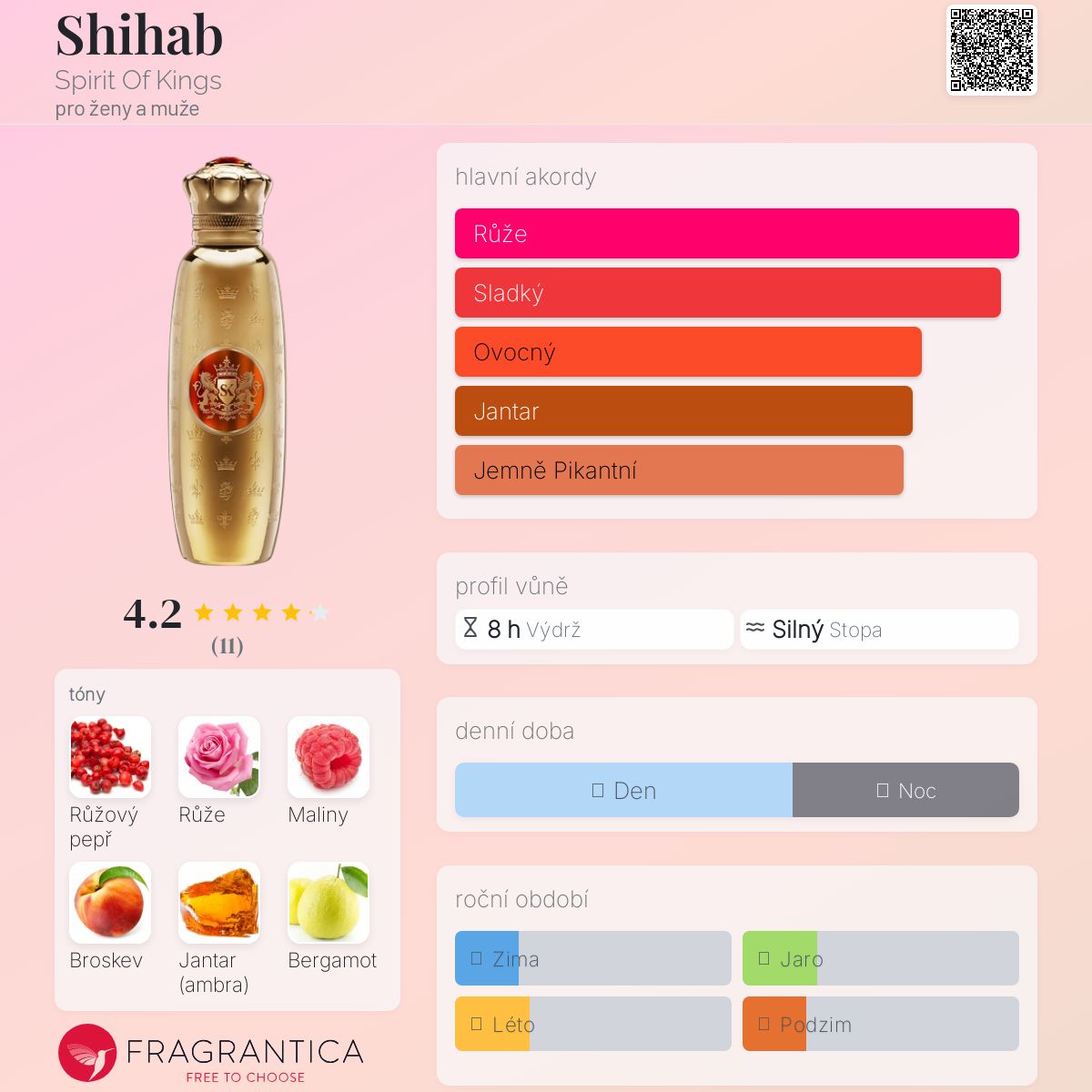 Shihab podle Spirit Of Kings je Floral Fruity vůně pro ženy a muže. Toto je nová vůně. Shihab byl/a uveden/a v roce 2024. "Nosem" za touto vůní je Christian Provenzano. Vrchní tóny jsou Růžový pepř, Maliny, Broskev, Bergamot a Jablko; střední tóny jsouRůže, Pačuli, Jasmín a Cedr ; základní tóny jsou Jantar (ambra), Santalové dřevo, Vanilka, Fazole tonka a Pižmo.
