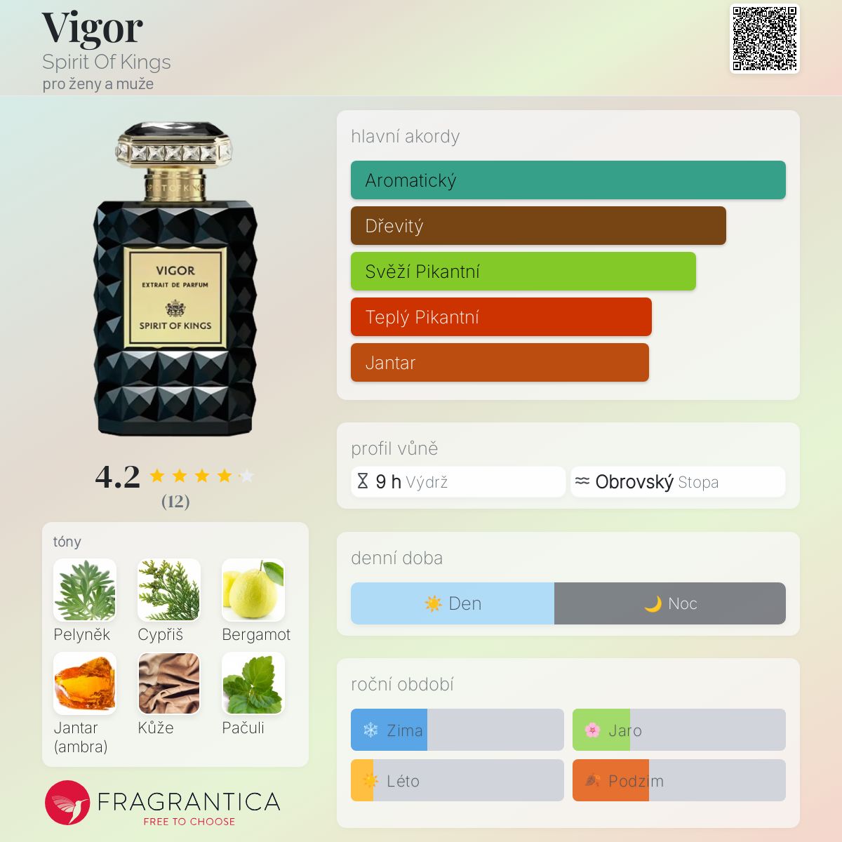 Vigor podle Spirit Of Kings je vůně pro ženy a muže. Vigor byl/a uveden/a v roce 2022. "Nosem" za touto vůní je Christian Provenzano. Vrchní tóny jsou Pelyněk, Bergamot a Kardamom; střední tóny jsouCypřiš, Skořice, Labdanum a Levandule ; základní tóny jsou Jantar (ambra), Kůže, Pačuli a Kašmírové pižmo.