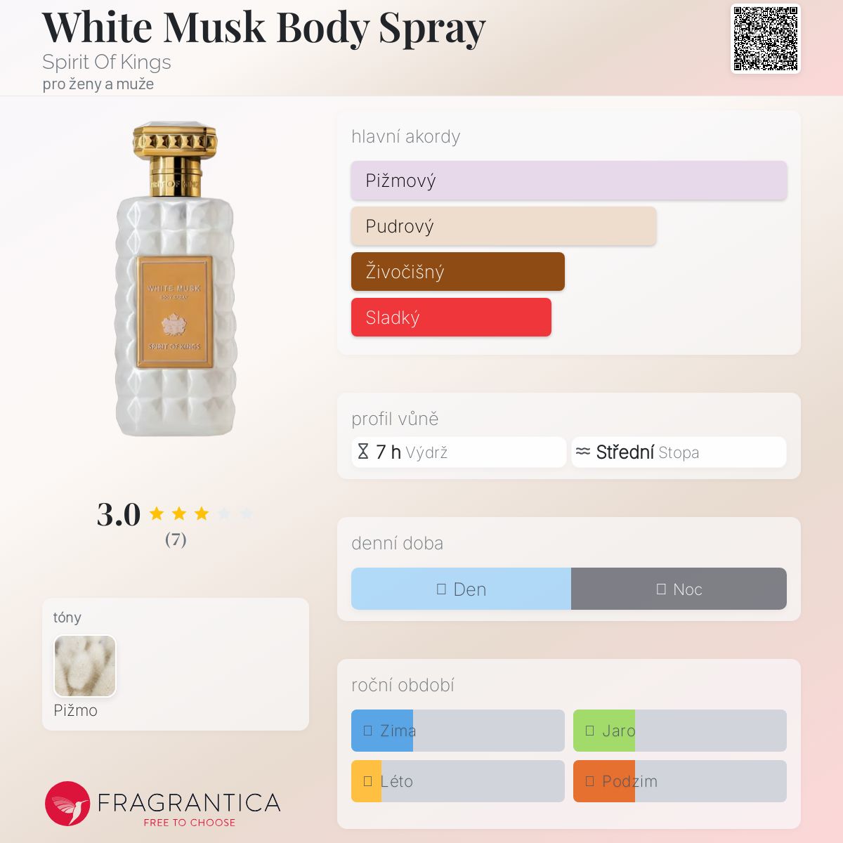 White Musk Body Spray podle Spirit Of Kings je vůně pro ženy a muže. Toto je nová vůně. White Musk Body Spray byl/a uveden/a v roce 2024.
