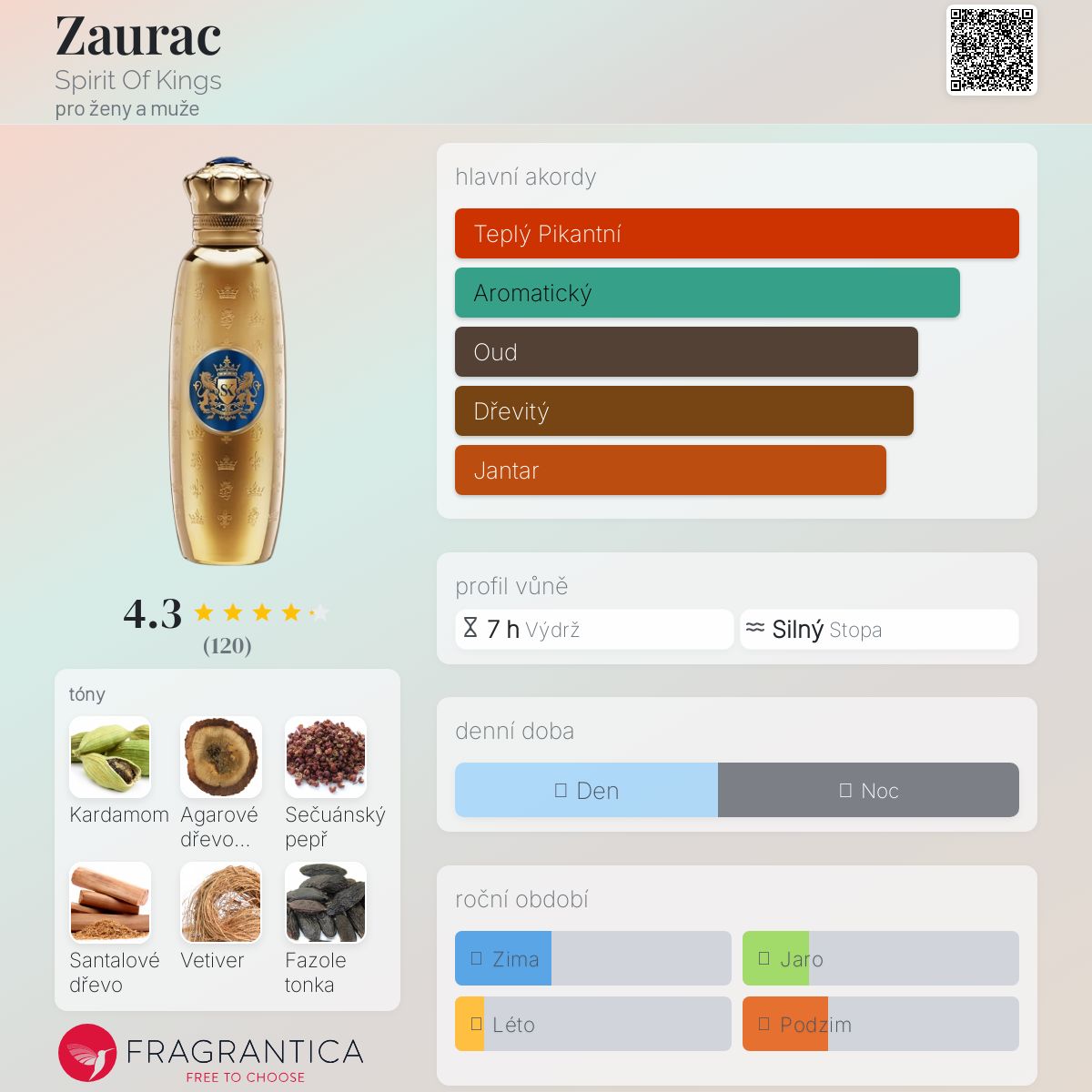 Zaurac podle Spirit Of Kings je Orientální Spicy vůně pro ženy a muže. Zaurac byl/a uveden/a v roce 2019. "Nosem" za touto vůní je Christian Provenzano. Vrchní tóny jsou Kardamom, Agarové dřevo (oud) a Sečuánský pepř; střední tóny jsouSantalové dřevo, Vetiver a Fazole tonka ; základní tóny jsou Jantar (ambra) a Vanilka.