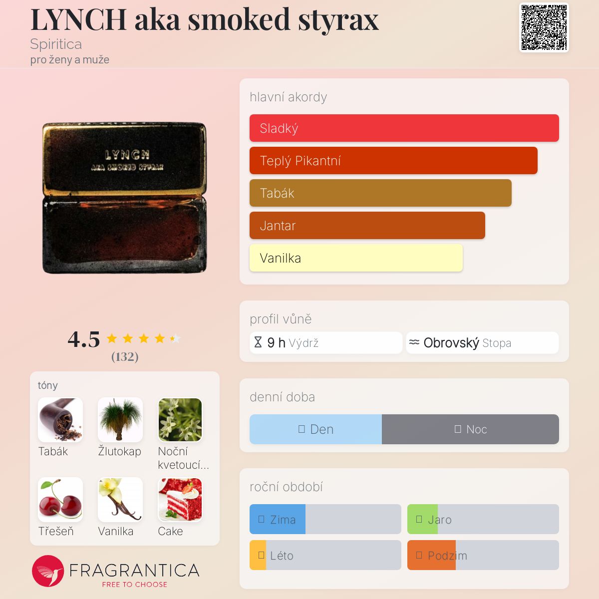 LYNCH aka smoked styrax podle Spiritica je vůně pro ženy a muže. Toto je nová vůně. LYNCH aka smoked styrax byl/a uveden/a v roce 2025. LYNCH aka smoked styrax byl/a vytvořen/a Daniele Muratori Caputo, Leonardo Opali a Paolo Cerizza. Vrchní tóny jsou Noční kvetoucí jasmín, Dort, Třešeň, Šafrán a Hřebíček; střední tóny jsouTabák, Žlutokap, Myrha, Agarové dřevo (oud) a Styrax ; základní tóny jsou Tabák, Vanilka, Dřevité tóny, Pačuli a Benzoin.