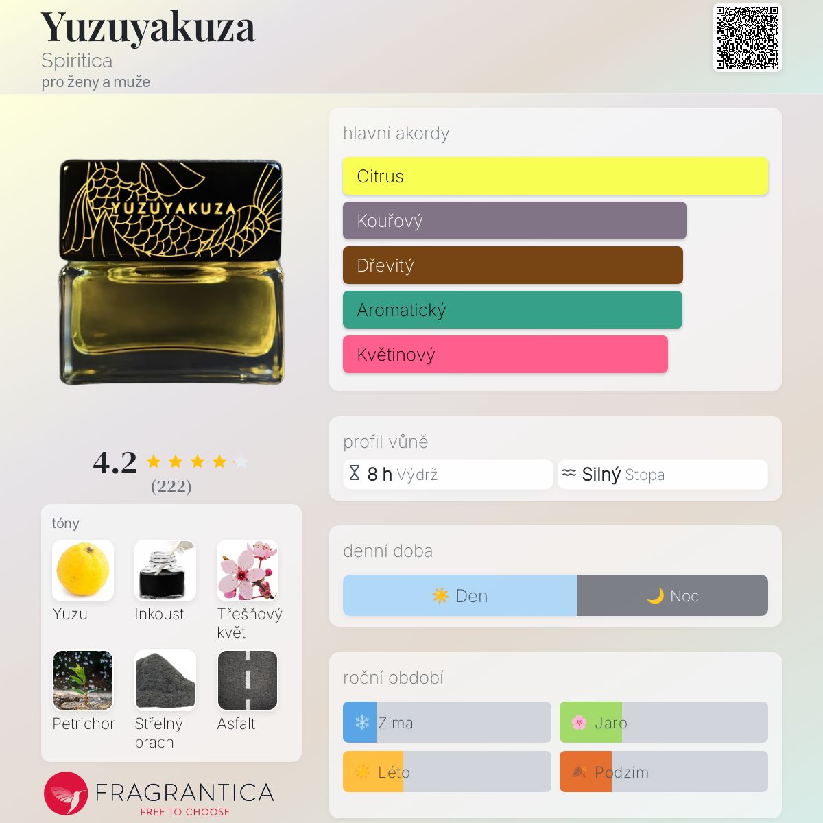 Yuzuyakuza podle Spiritica je vůně pro ženy a muže. Toto je nová vůně. Yuzuyakuza byl/a uveden/a v roce 2025. Yuzuyakuza byl/a vytvořen/a Luca Maffei, Daniele Muratori Caputo a Lorenzo Berti. Vrchní tóny jsou Yuzu, Střelný prach, Sudachi citrus, Ananas a Grapefruit; střední tóny jsouInkoust, Třešňový květ, Asfalt a Petrichor ; základní tóny jsou Kadidlo, Semiš, Mahagon a Cedr.