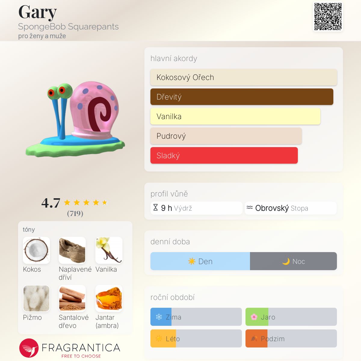 Gary podle SpongeBob Squarepants je Floral Woody Musk vůně pro ženy a muže. Vrchní tóny jsou Citrusy a Pomerančový květ; střední tóny jsouKokosový nektar, Vanilkový květ a Jantar (ambra) ; základní tóny jsou Naplavené dříví, Pižmo a Santalové dřevo.