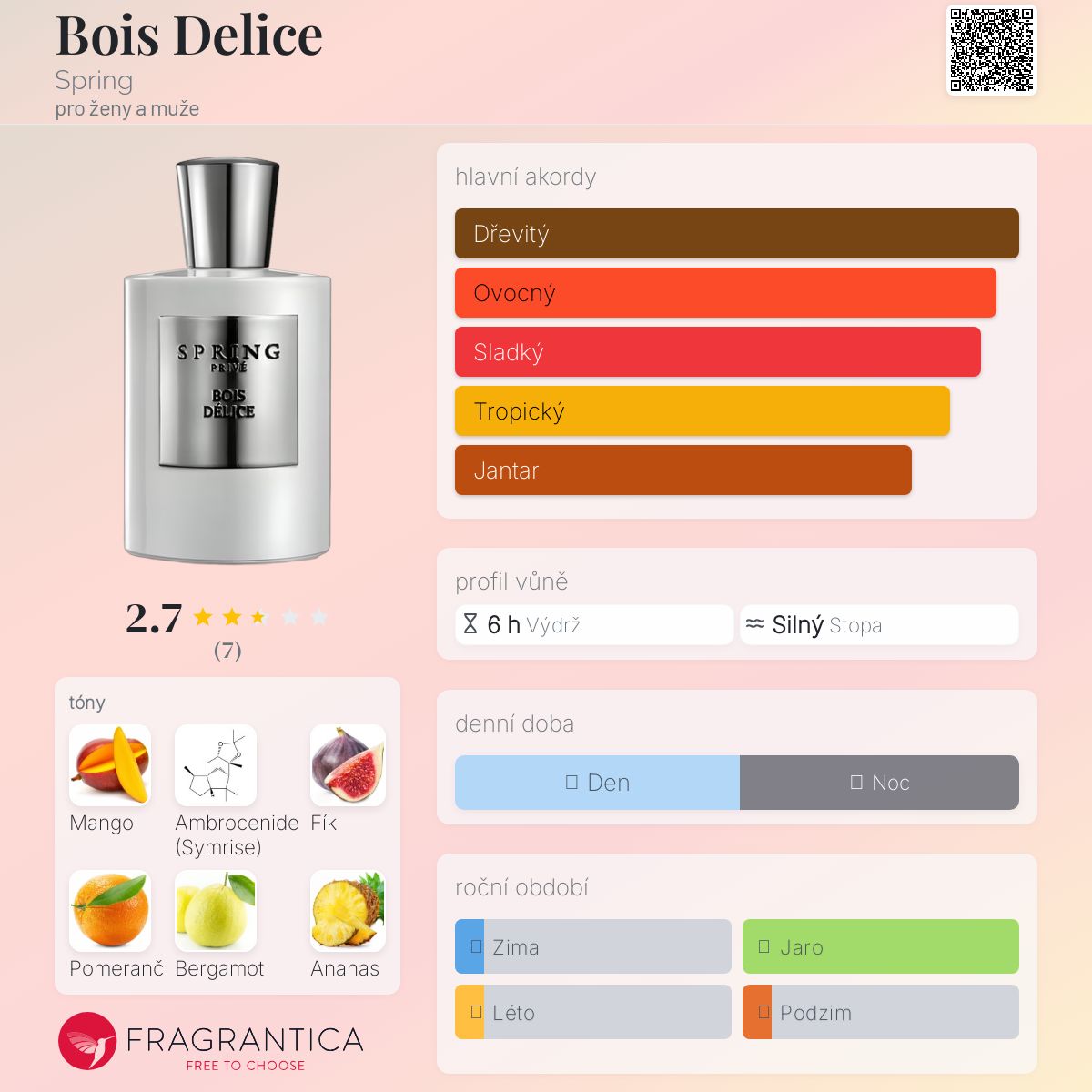 Bois Delice podle Spring je Woody Aromatic vůně pro ženy a muže. Bois Delice byl/a uveden/a v roce 2018. "Nosem" za touto vůní je Emmanuelle Rivat. Vrchní tóny jsou Fík, Pomeranč a Bergamot; střední tóny jsouMango, Ananas a Lískový oříšek ; základní tóny jsou Ambrocenide, Pižmo, Vanilka, Vzácné dřevo a Dřevité tóny.