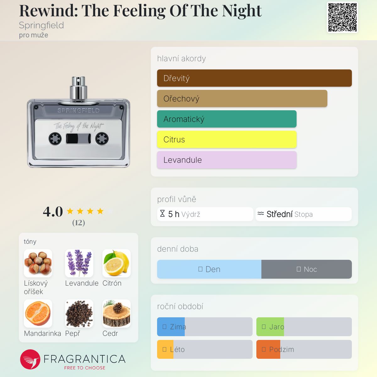 Rewind: The Feeling Of The Night podle Springfield je Woody Spicy vůně pro muže. Rewind: The Feeling Of The Night byl/a uveden/a v roce 2019. Vrchní tóny jsou Citrón, Mandarinka a Pepř; střední tóny jsouLískový oříšek a Levandule ; základní tóny jsou Cedr, Vetiver a Labdanum.