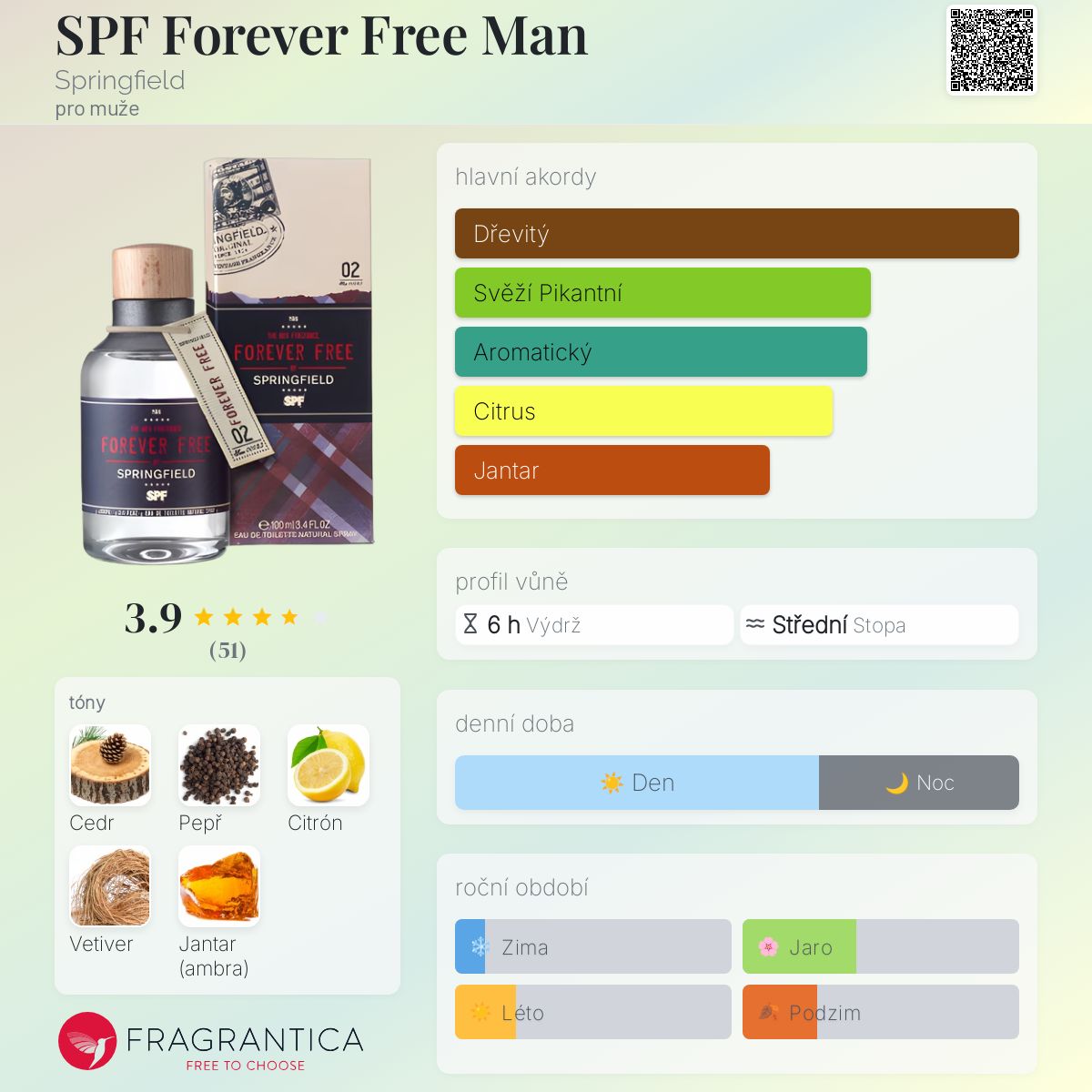 SPF Forever Free Man podle Springfield je Woody Spicy vůně pro muže. Vrchní tóny jsou Černý pepř a Citrón; střední tóny jsouCedr a Vetiver ; základní tón je Jantar (ambra).