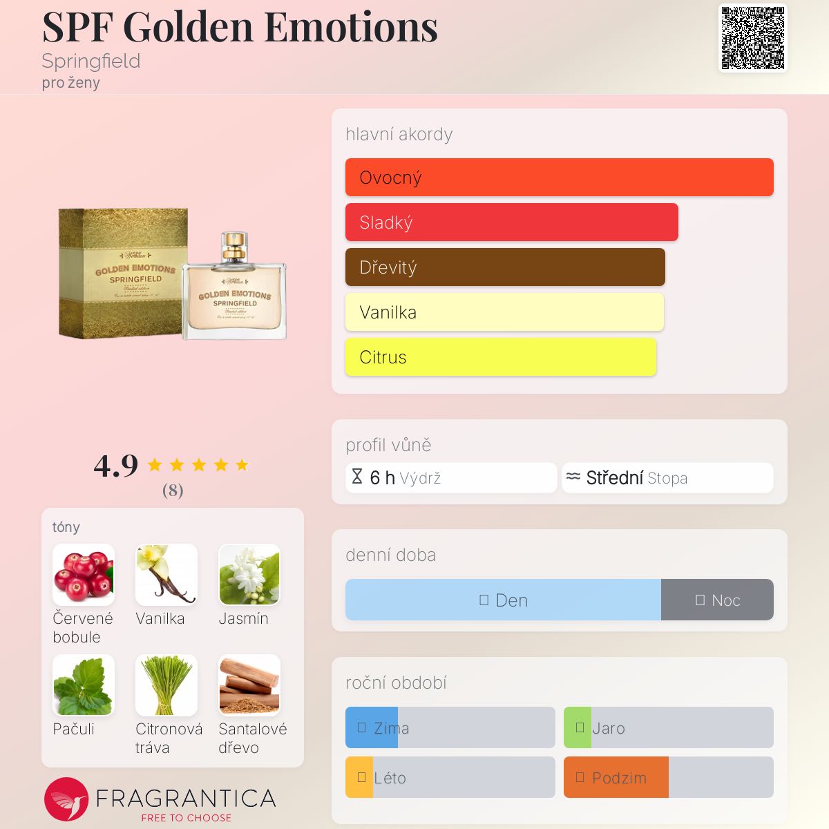SPF Golden Emotions podle Springfield je Orientální Floral vůně pro ženy. SPF Golden Emotions byl/a uveden/a v roce 2013. Vrchní tóny jsou Citronová tráva, Bergamot, Citrusy a Fialka; střední tóny jsouČervené bobule, Jasmín, Ovocné tóny a Pepř ; základní tóny jsou Vanilka, Pačuli, Santalové dřevo a Pižmo.