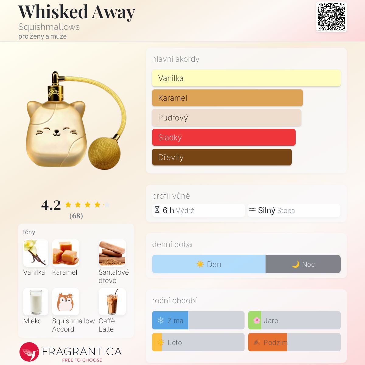 Whisked Away podle Squishmallows je Orientální Vanilla vůně pro ženy a muže. Toto je nová vůně. Whisked Away byl/a uveden/a v roce 2025. Vrchní tóny jsou Karamel, Mléko a Skořice; střední tóny jsouOrchidej, Okvětní lístky frézie a Bílá broskev ; základní tóny jsou Vanilka, Santalové dřevo, Akord Squishmallow a Caffè Latte.