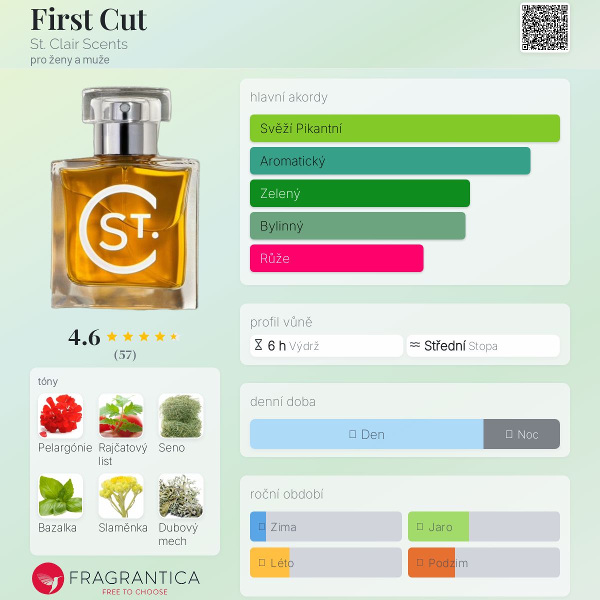 First Cut podle St. Clair Scents je Aromatic Fougere vůně pro ženy a muže. First Cut byl/a uveden/a v roce 2018. "Nosem" za touto vůní je Diane St.Clair. Vrchní tóny jsou Rajčatový list, Bazalka, Bergamot, Rozmarýn a Yuzu; střední tóny jsouGeranium růže, Slaměnka, Růže de Mai a Levandule ; základní tóny jsou Seno, Dubový mech, Vanilka a Tabák.