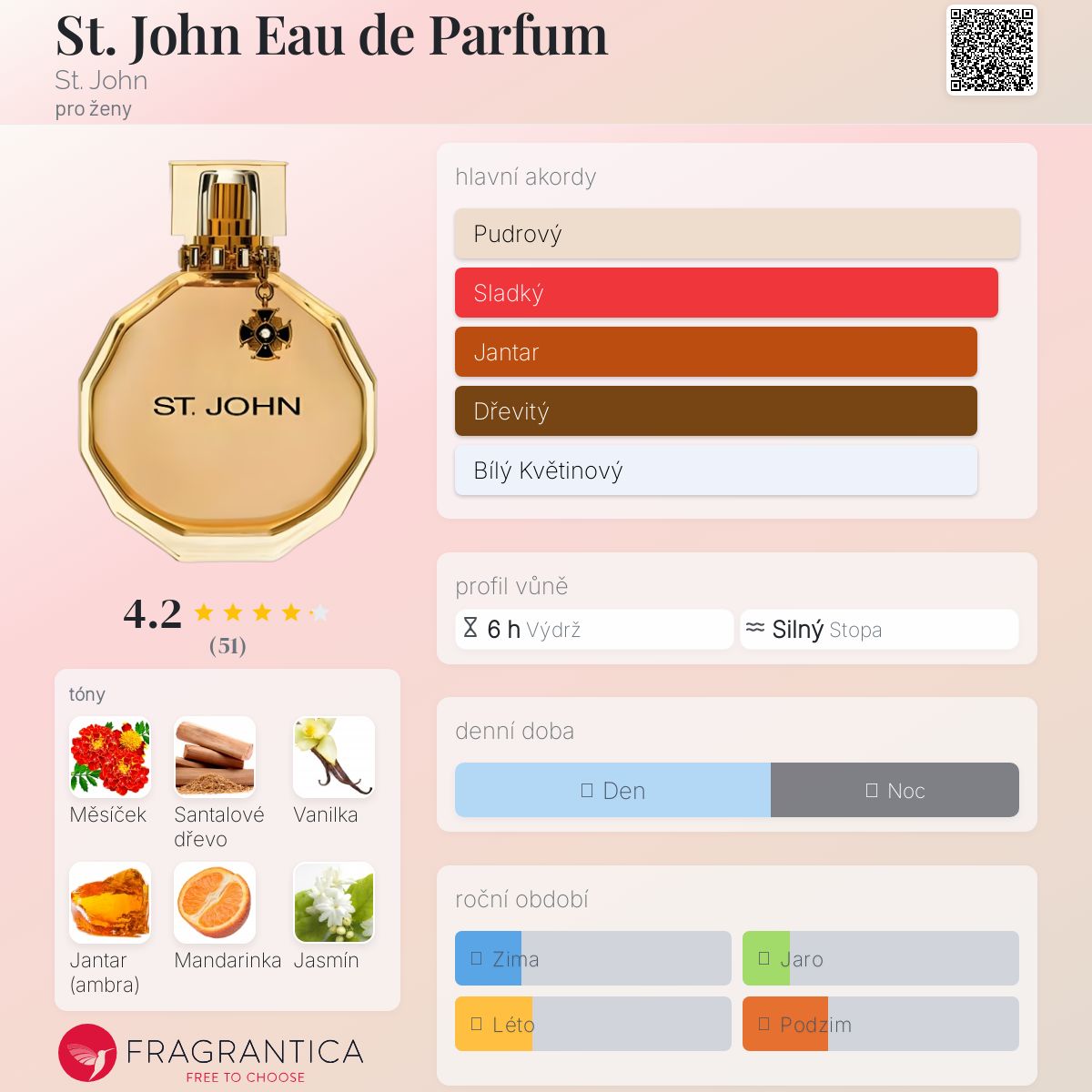 St. John Eau de Parfum podle St. John je Floral vůně pro ženy. St. John Eau de Parfum byl/a uveden/a v roce 2008. Vrchní tóny jsou Aksamitník, Mandarinka a Frézie; střední tóny jsouJasmín, Meruňka a Růže ; základní tóny jsou Santalové dřevo, Vanilka a Jantar (ambra).