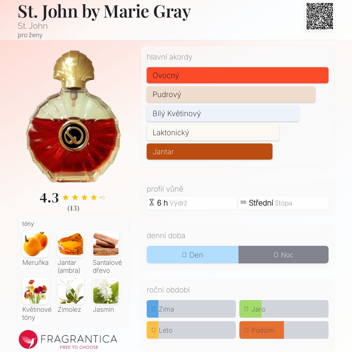 St. John by Marie Gray podle St. John je Floral vůně pro ženy. St. John by Marie Gray byl/a uveden/a v roce 1994. Vrchní tón je Orientální květinové tóny ; střední tóny jsouZimolez, Jasmín a Gardénie ; základní tóny jsou Meruňka, Jantar (ambra), Santalové dřevo a Pižmo.